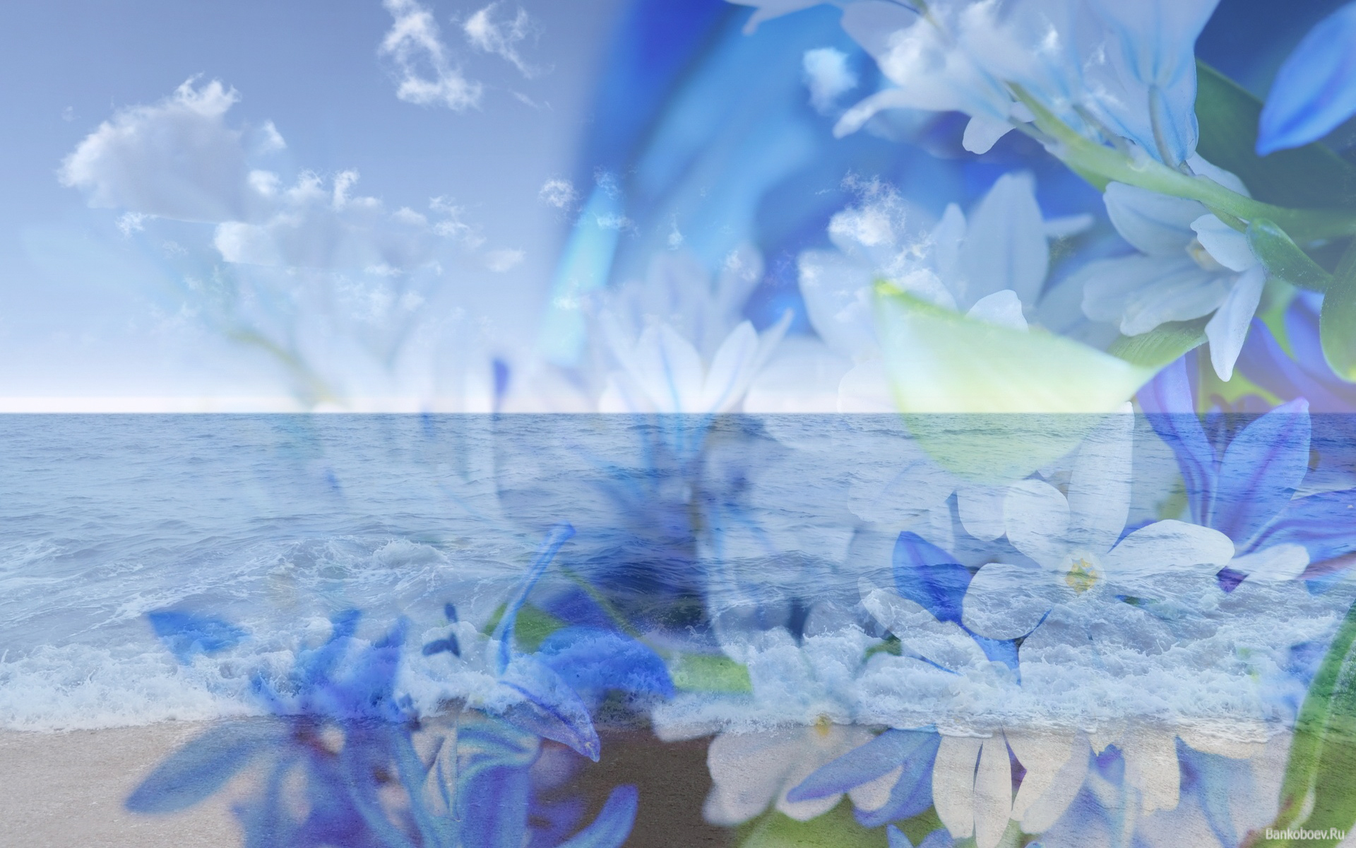Скачать обои для рабочего стола На фоне моря бело-голубая веточка и фото