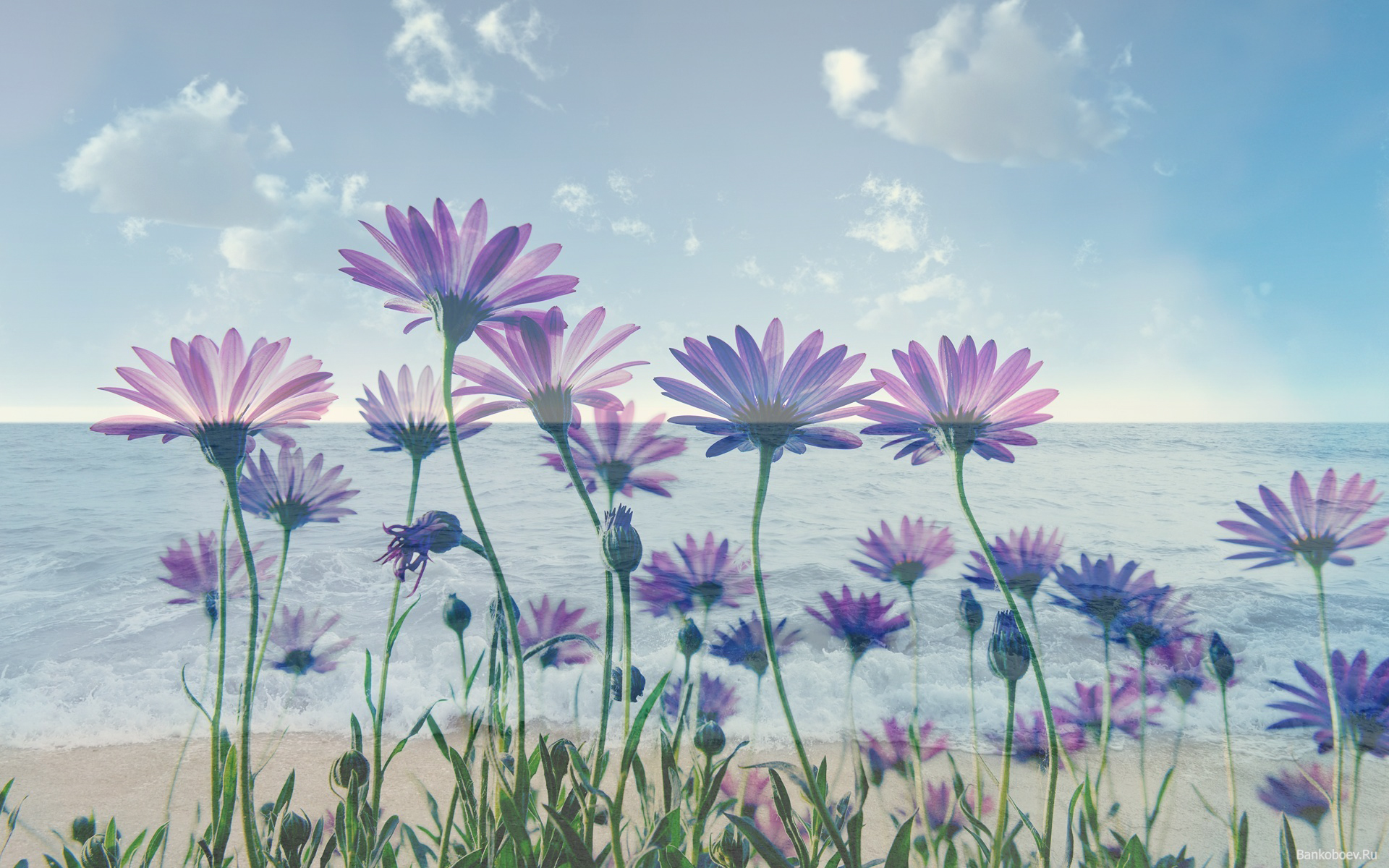 Скачать обои для рабочего стола На фоне моря поляна цветов и фото