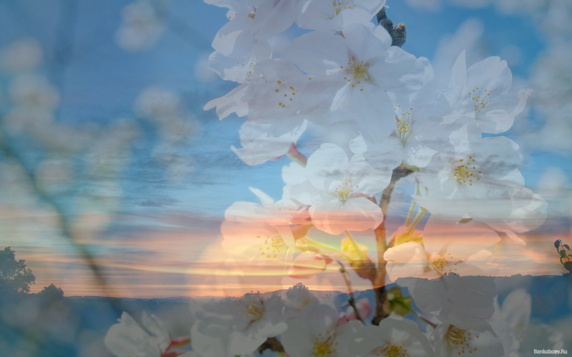 Скачать обои для рабочего стола На фоне заката цветущая ветка и фото