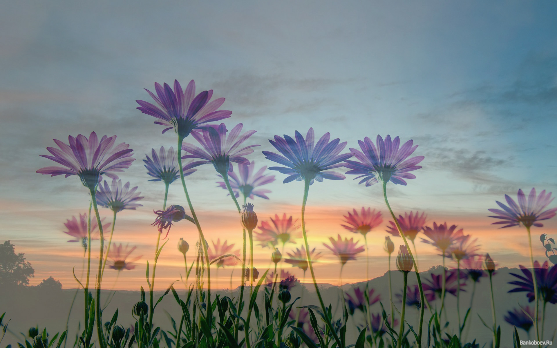 Скачать обои для рабочего стола На фоне заката фиолетовые цветы и фото