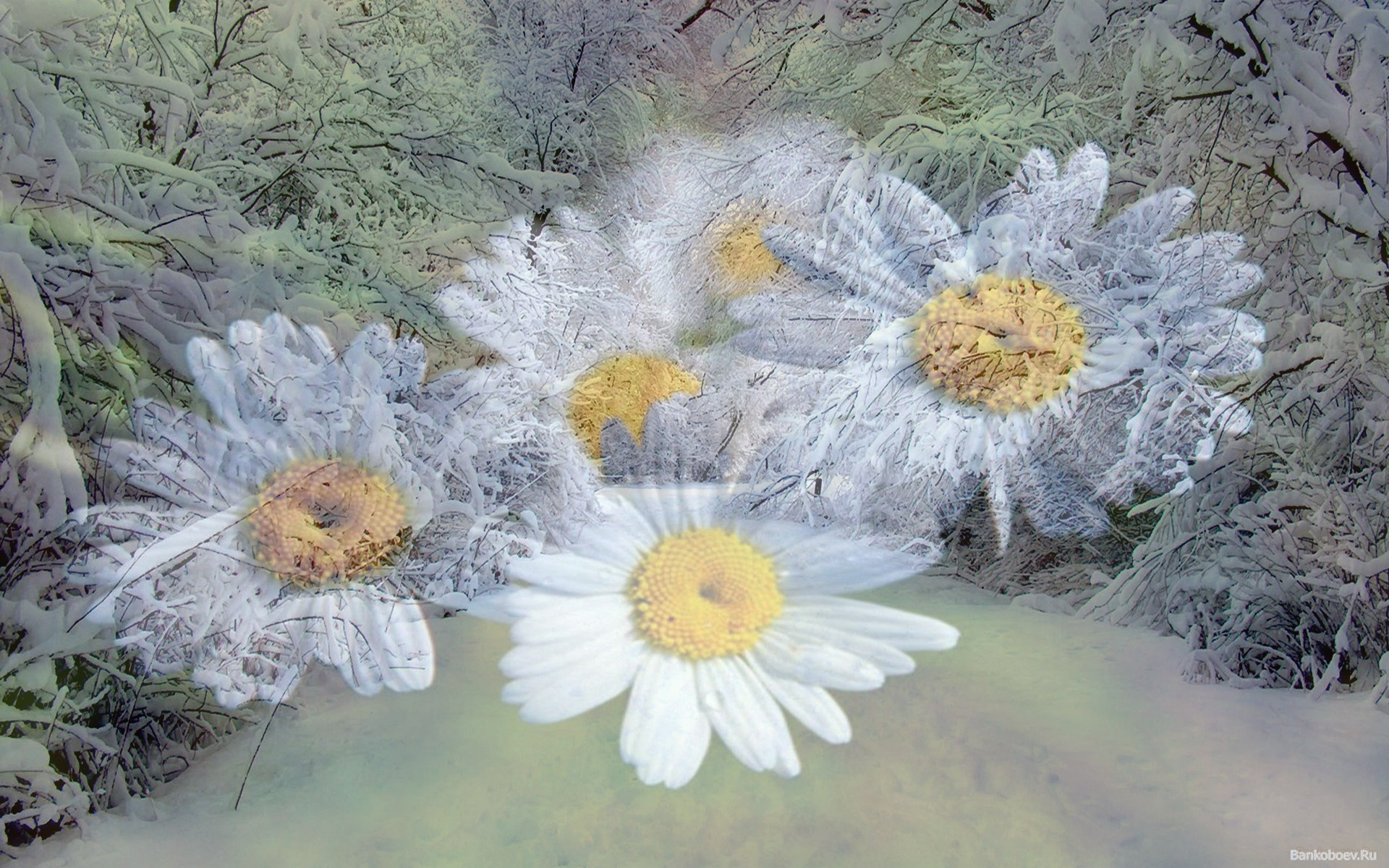 Похожие обои на На фоне заснеженной аллеи букет ромашек: