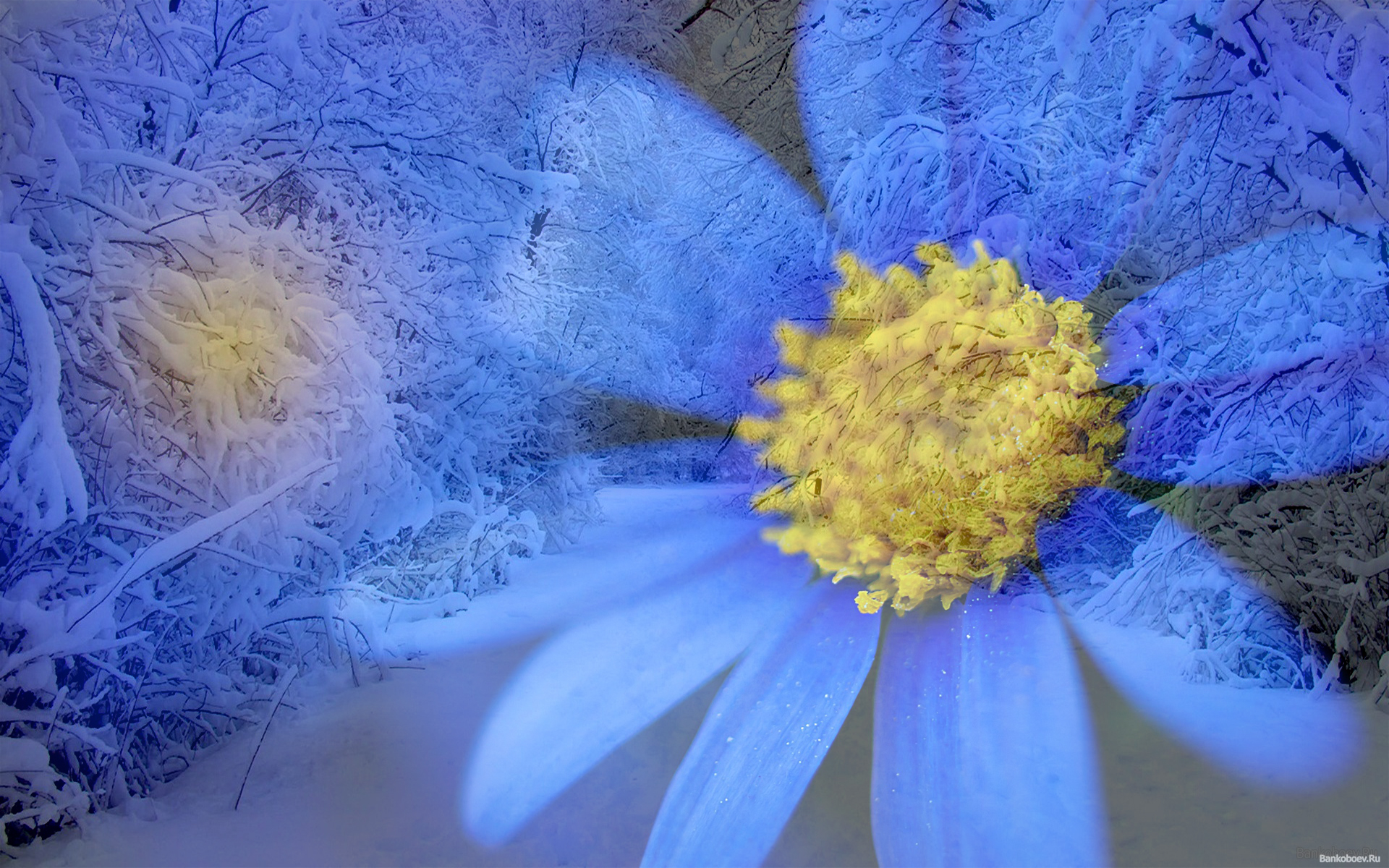 Скачать обои для рабочего стола На фоне заснеженной аллеи синий цветок и фото