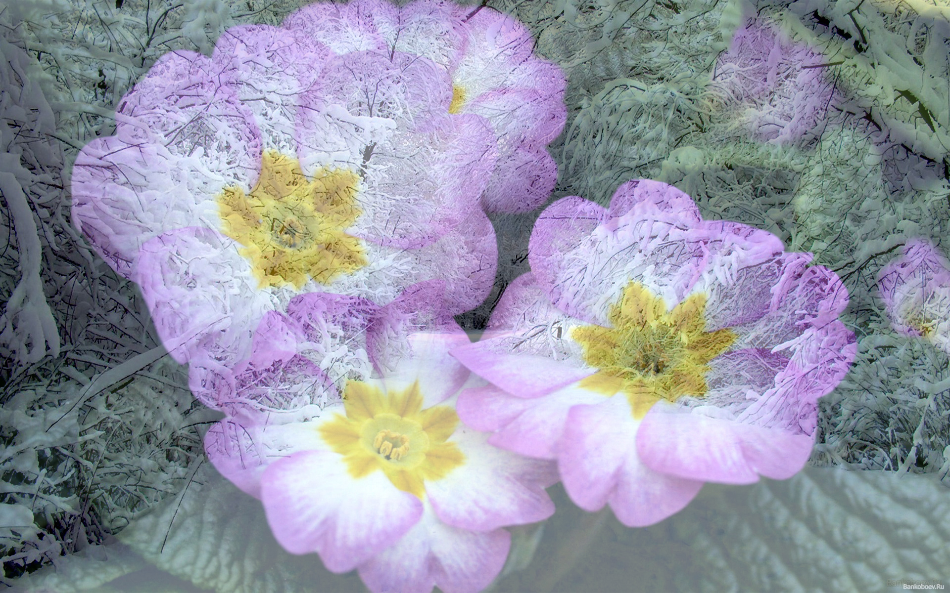 Скачать обои для рабочего стола На фоне заснеженной аллеи трехцветный цветок и фото