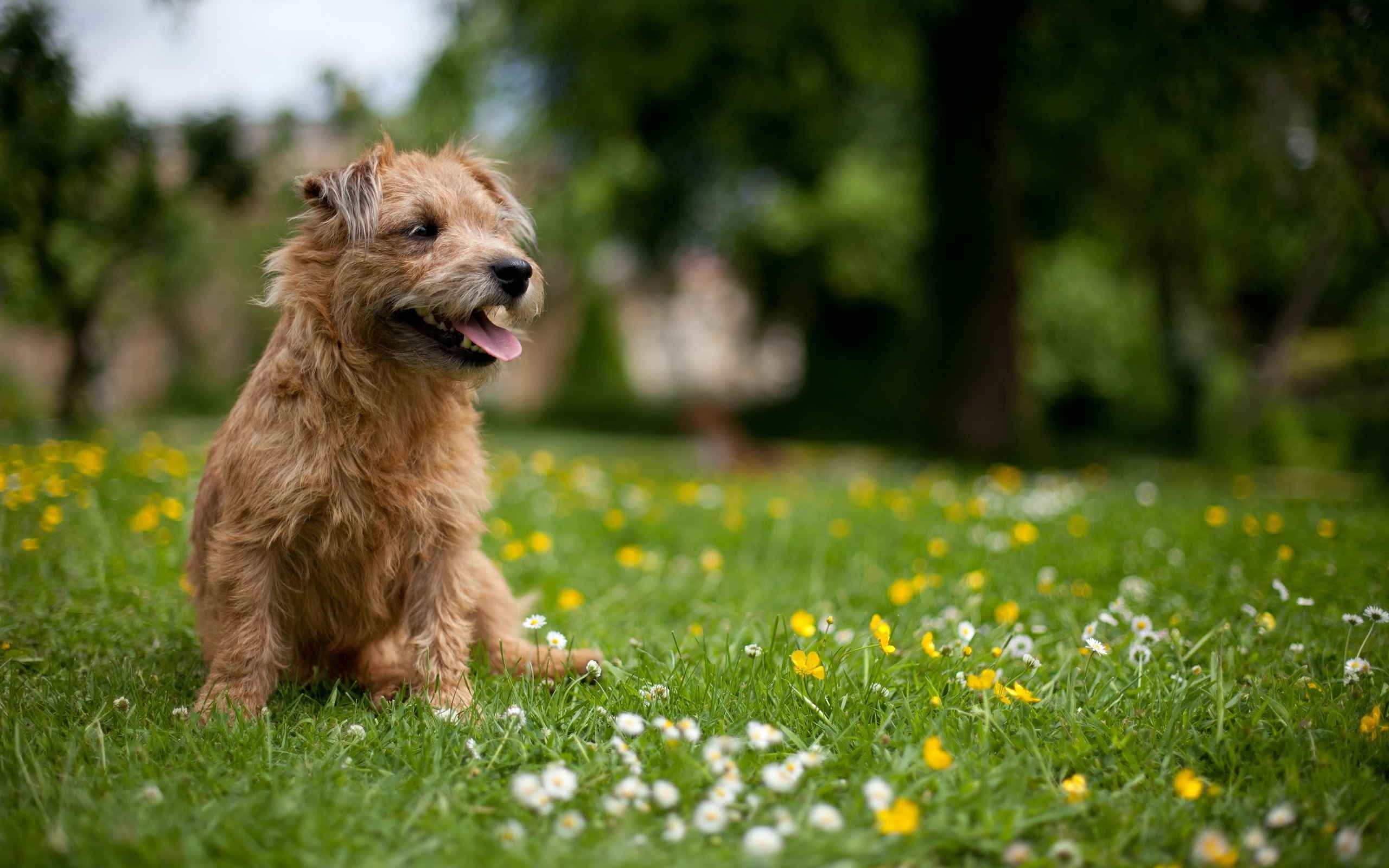 Скачать обои для рабочего стола На лужайке весенней собака сидит и фото