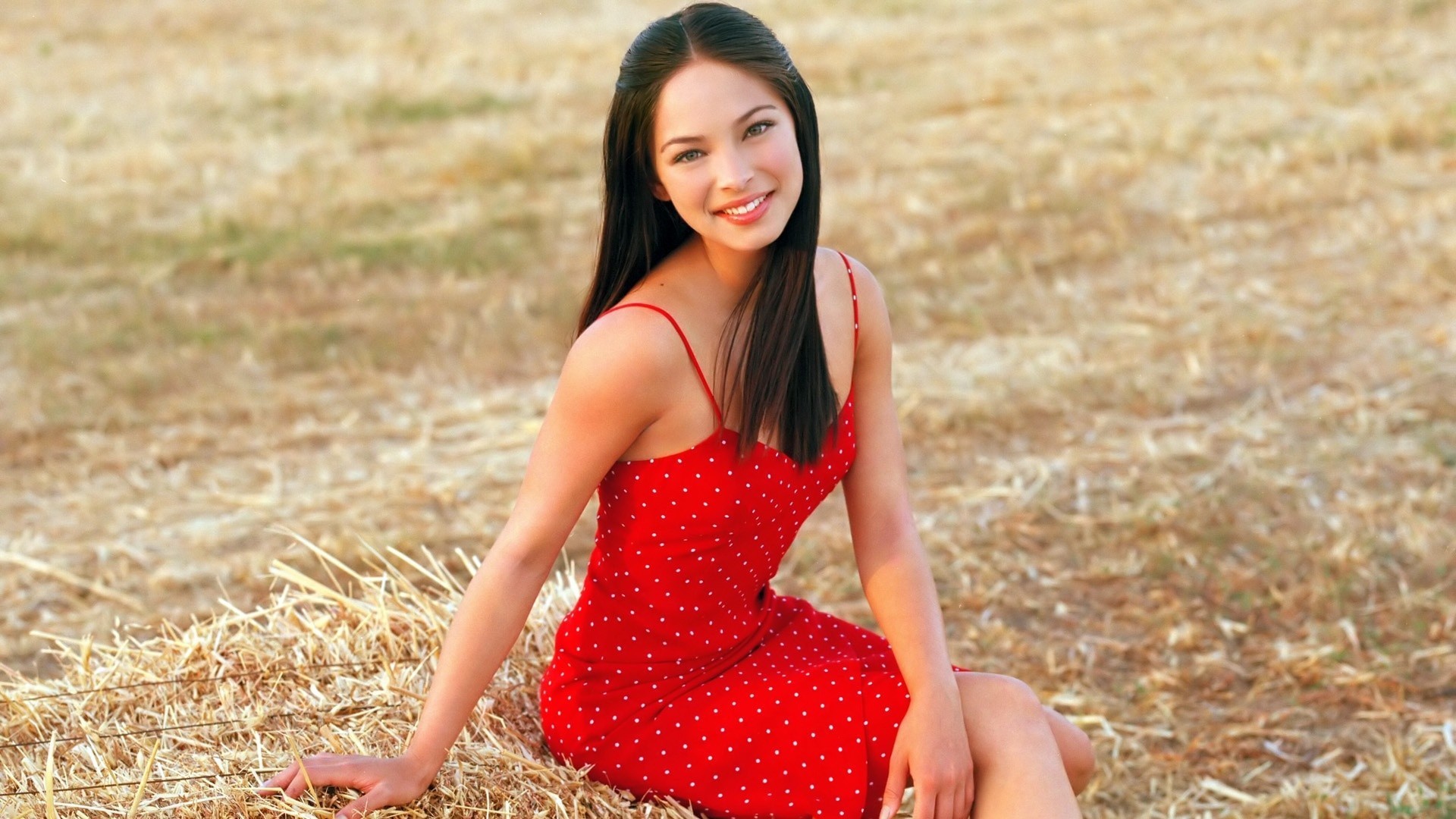 Обои На соломе девушка сидит в красном сарафане в горошек