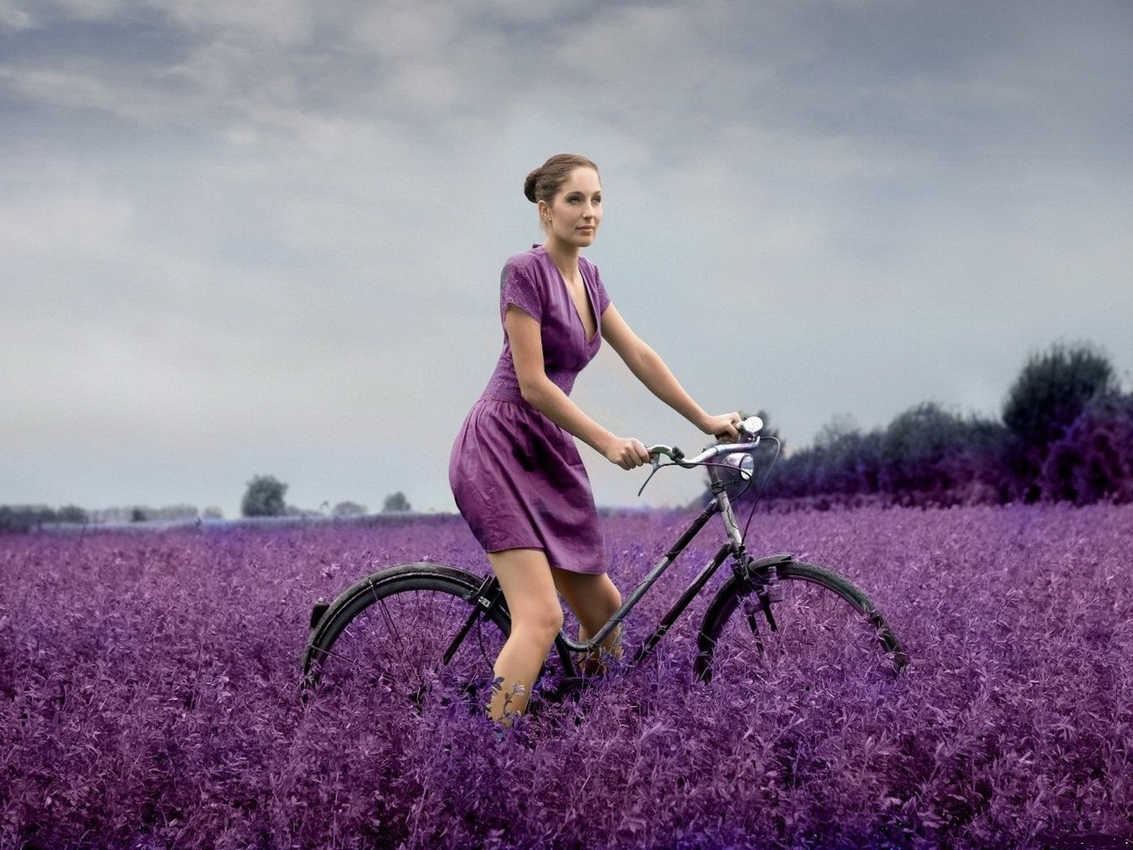 Похожие обои на На велосипеде в сиреневом платье по сиреневому полю: