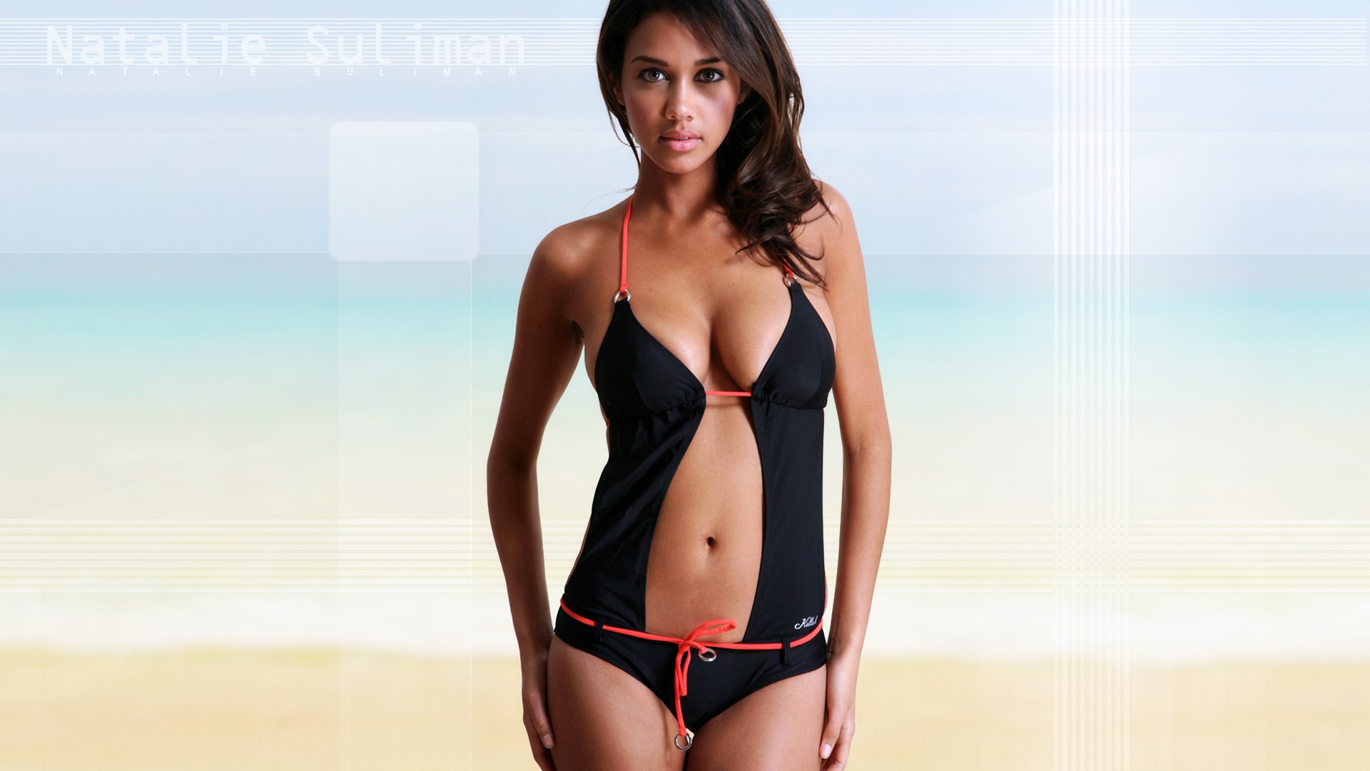 Скачать обои для рабочего стола Natalie Suliman в черном слитном купальнике и фото