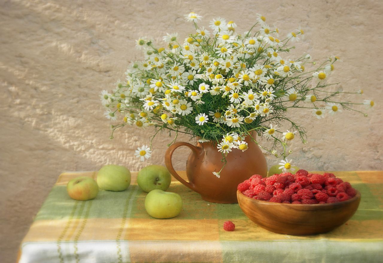 Скачать обои для рабочего стола Натюрморт - Цветы, малина и яблоки и фото