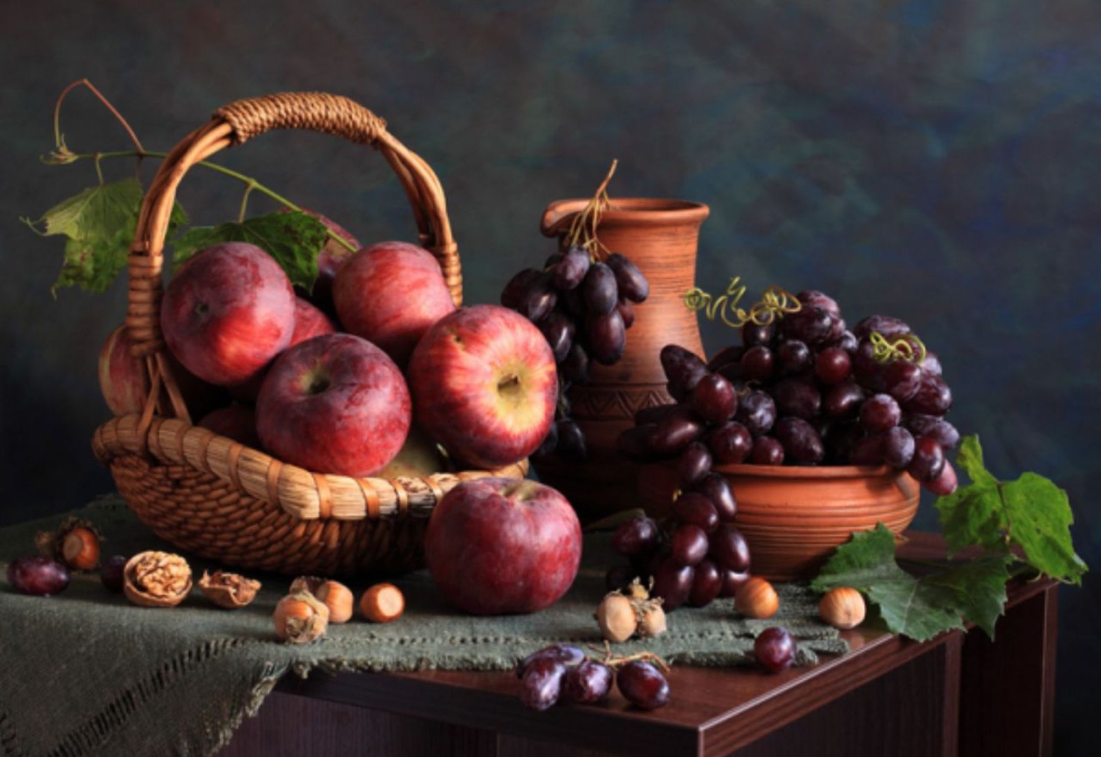Скачать обои для рабочего стола Натюрморт - Виноград в кувшине а яблоки в корзине и фото