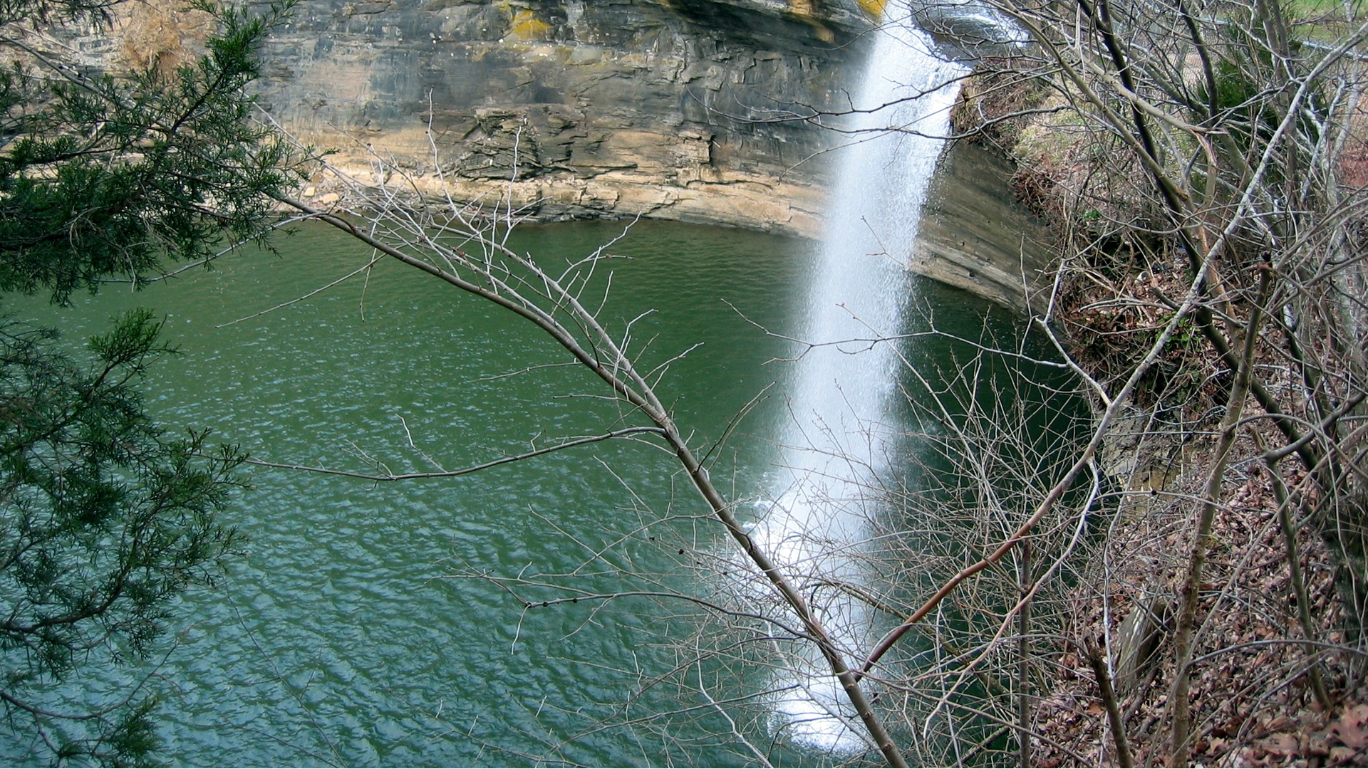 Скачать обои для рабочего стола Небольшой водопад впадающий в реку и фото