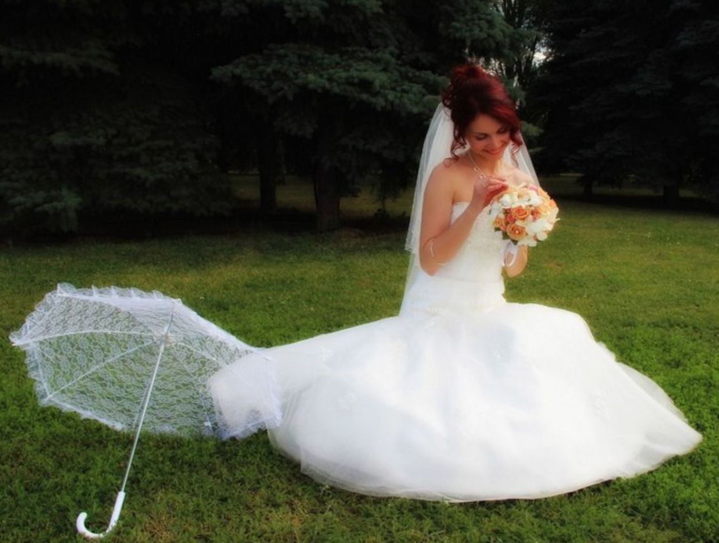 Скачать обои для рабочего стола Невеста с букетом и зонтиком и фото