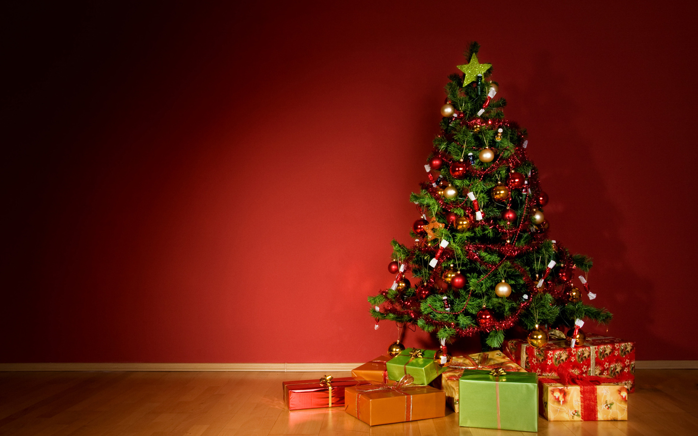 Скачать обои для рабочего стола New Year, украшенная елка и подарки и фото