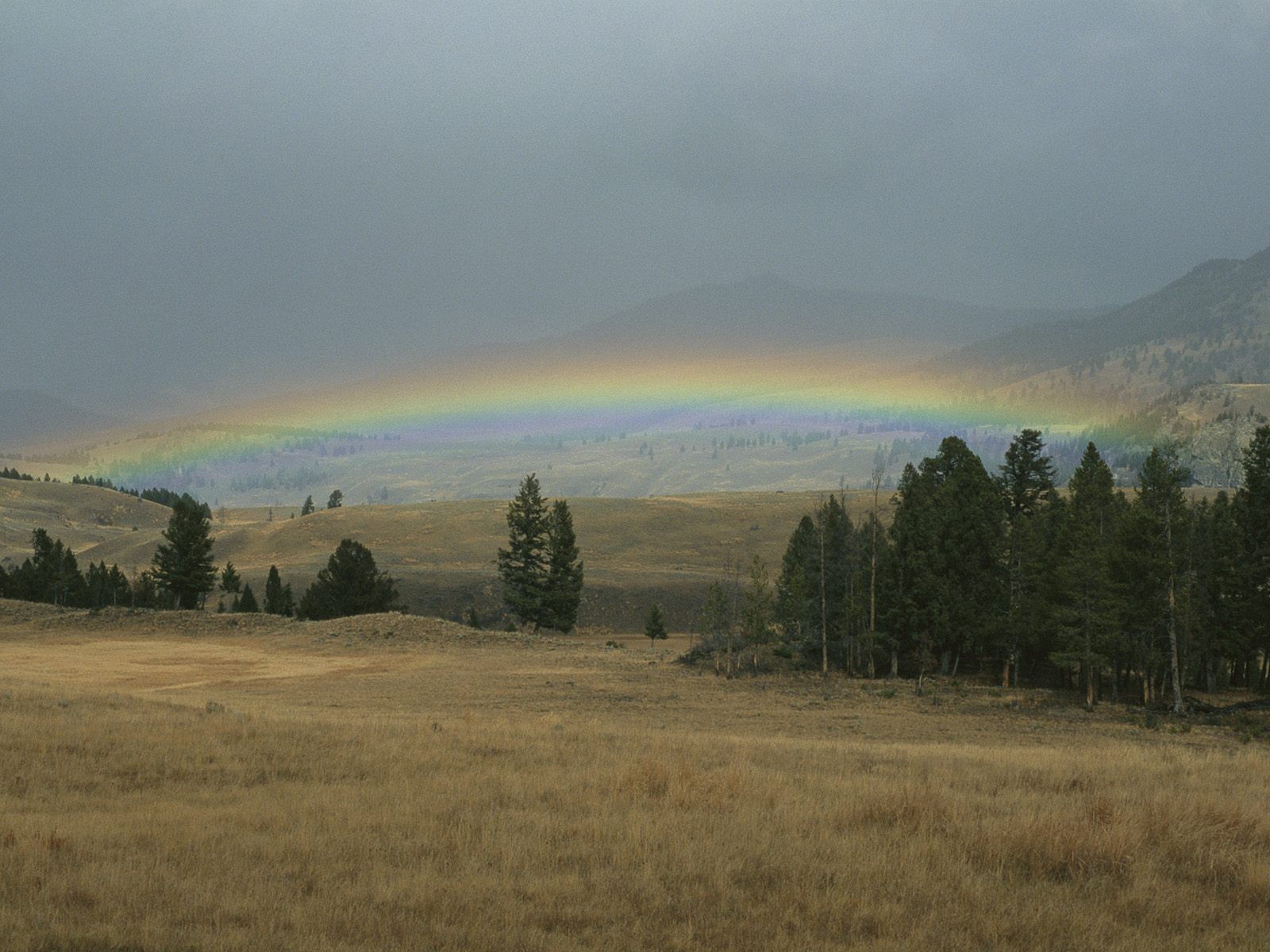 Скачать обои для рабочего стола Низкая радуга над холмами и фото