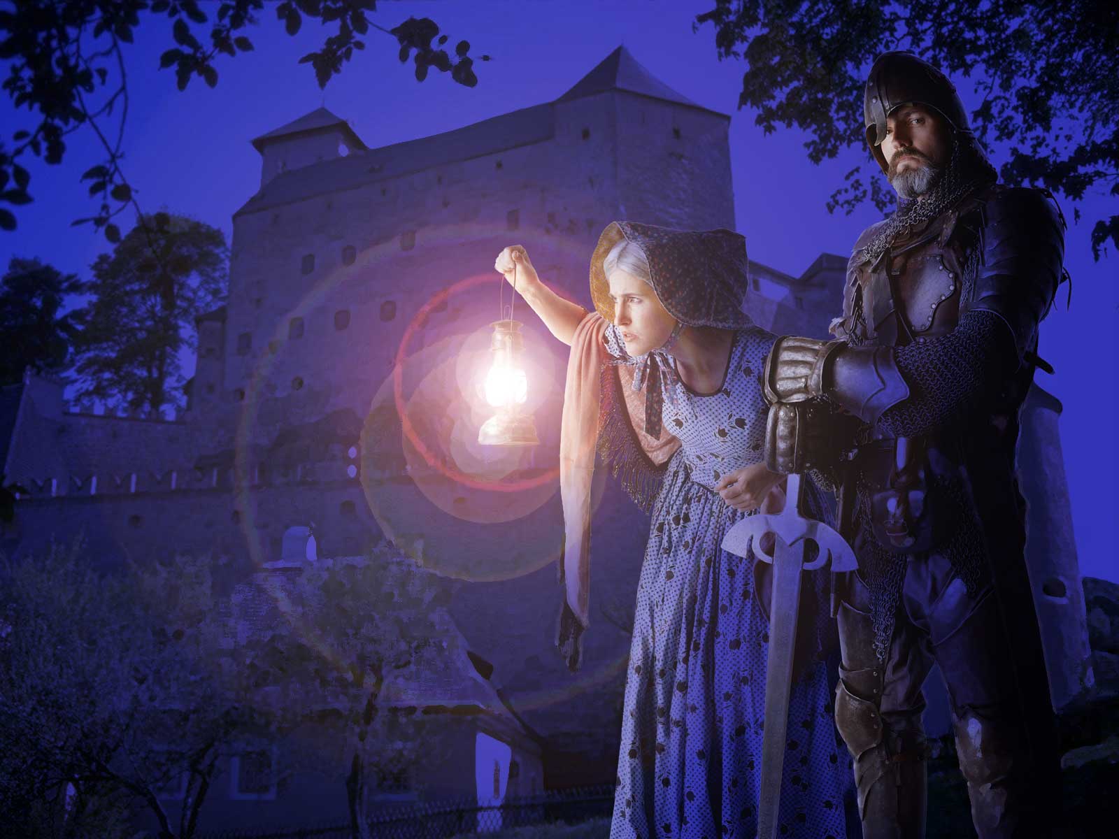 Похожие обои на Ночь, рыцарь и девушка с фонариком: