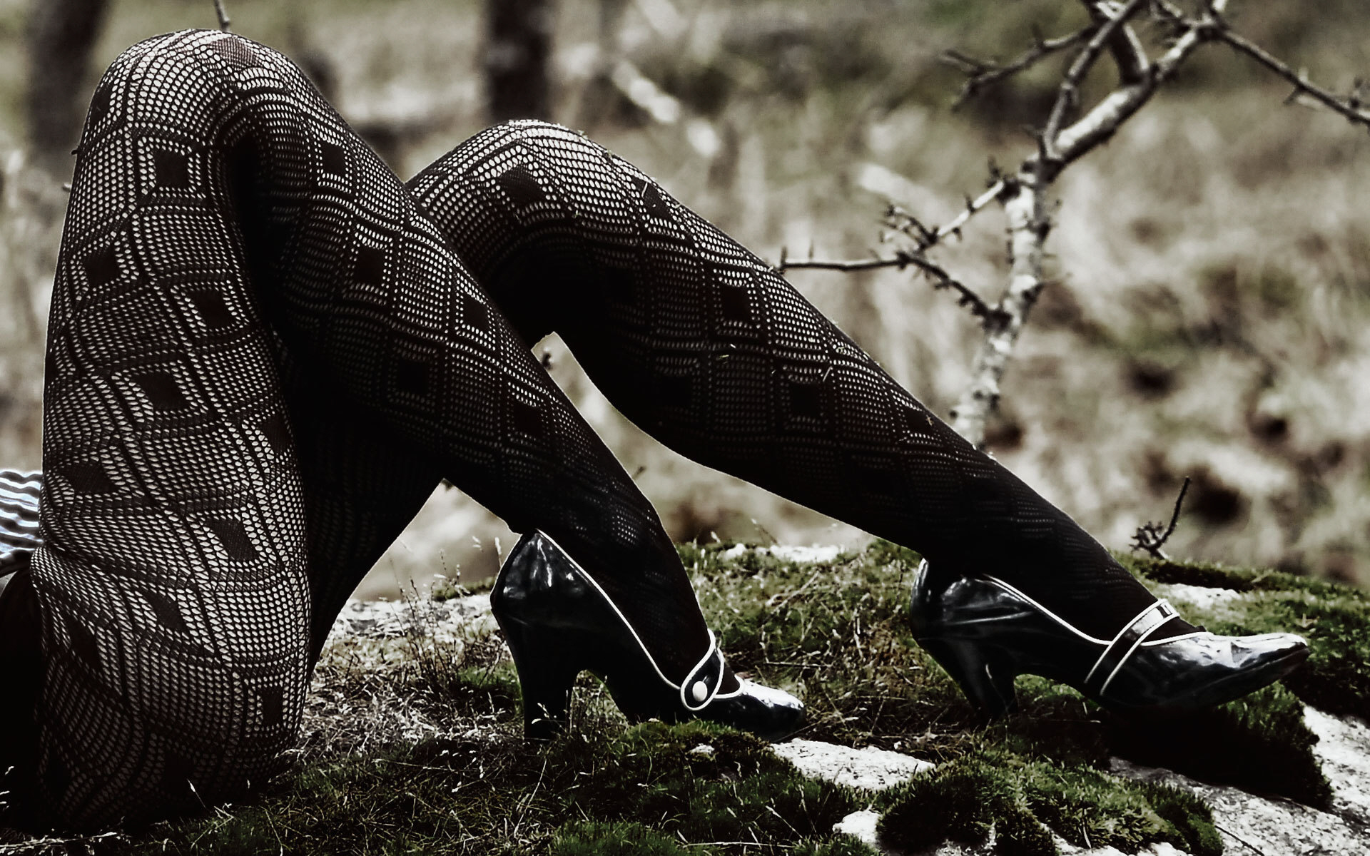 Скачать обои для рабочего стола Ноги в туфлях и колготках на природе и фото