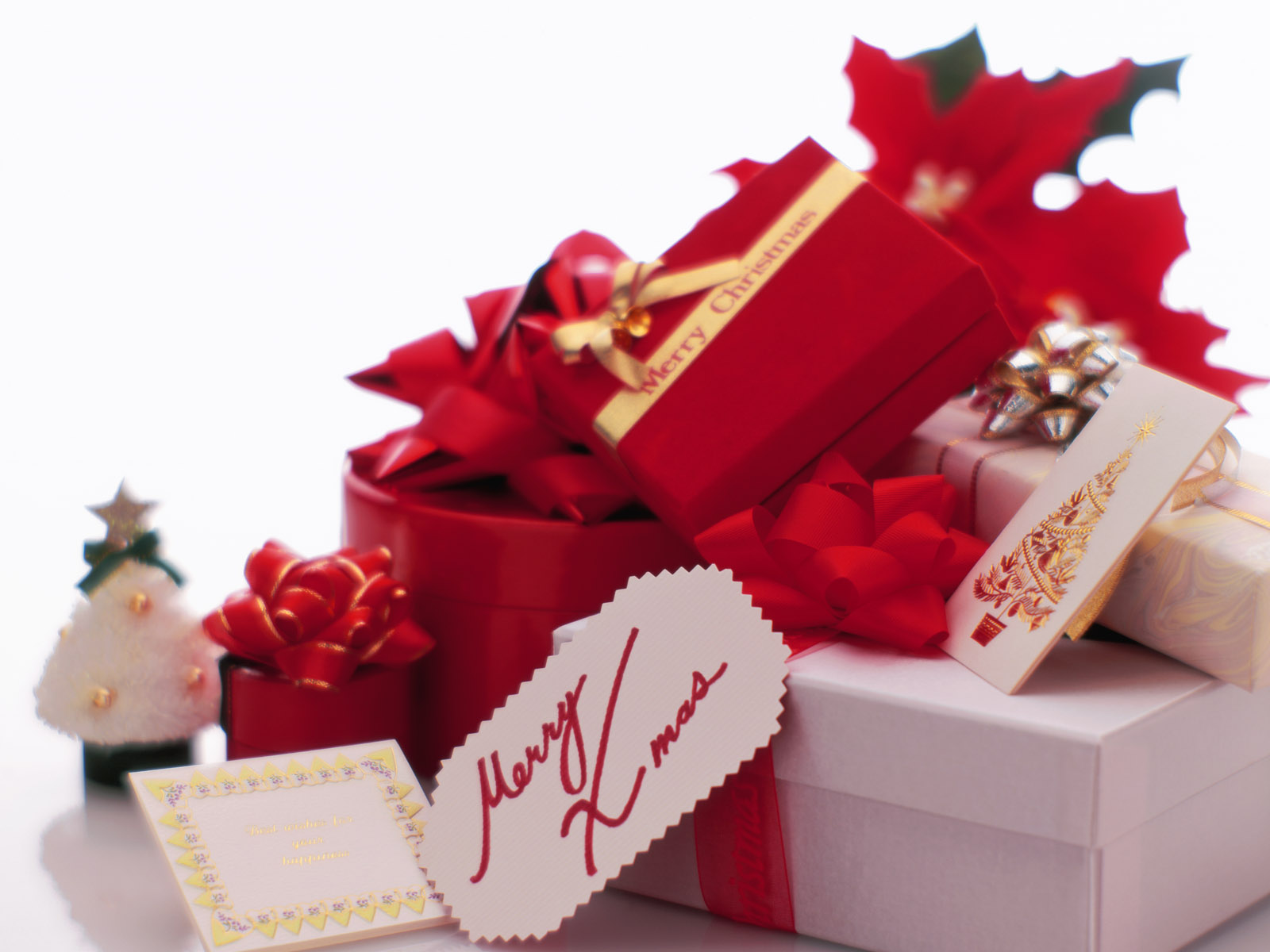 Скачать обои для рабочего стола Новогодние коробки для подарков с открытками и бантами и фото