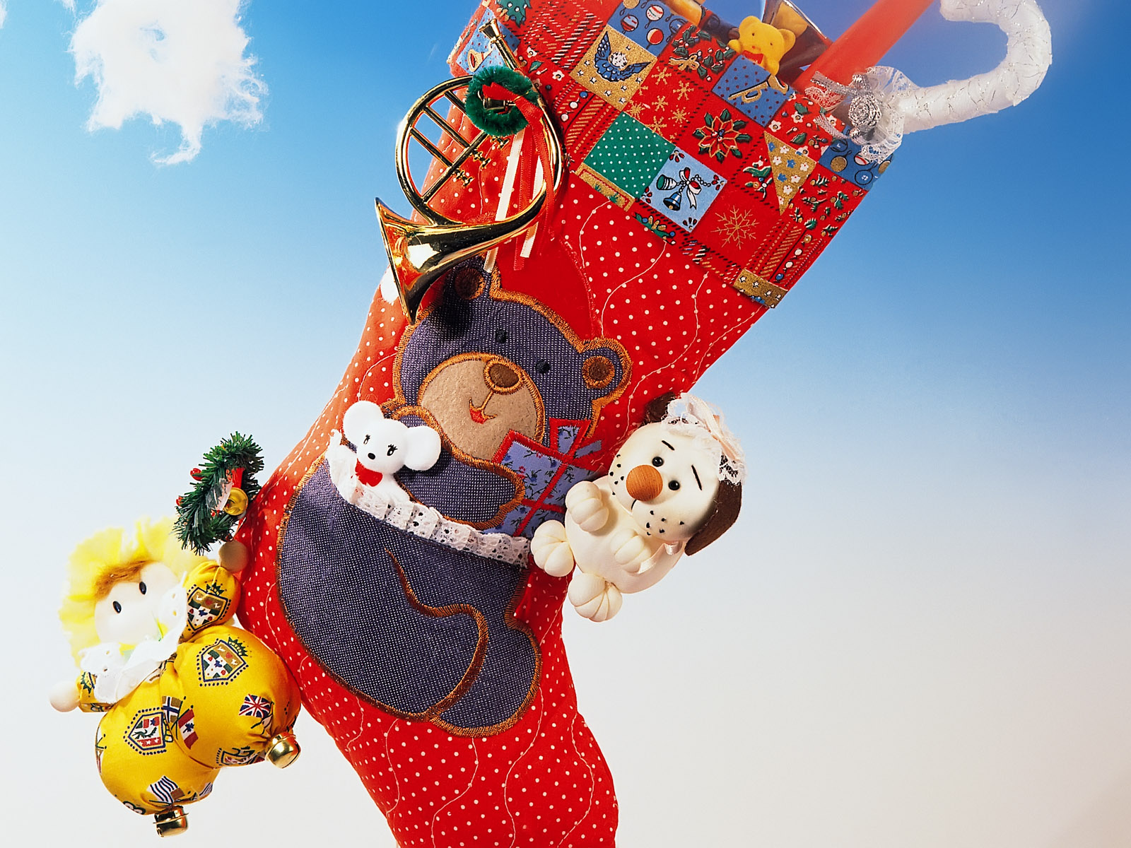 Скачать обои для рабочего стола Новогодний сапог с игрушками и фото