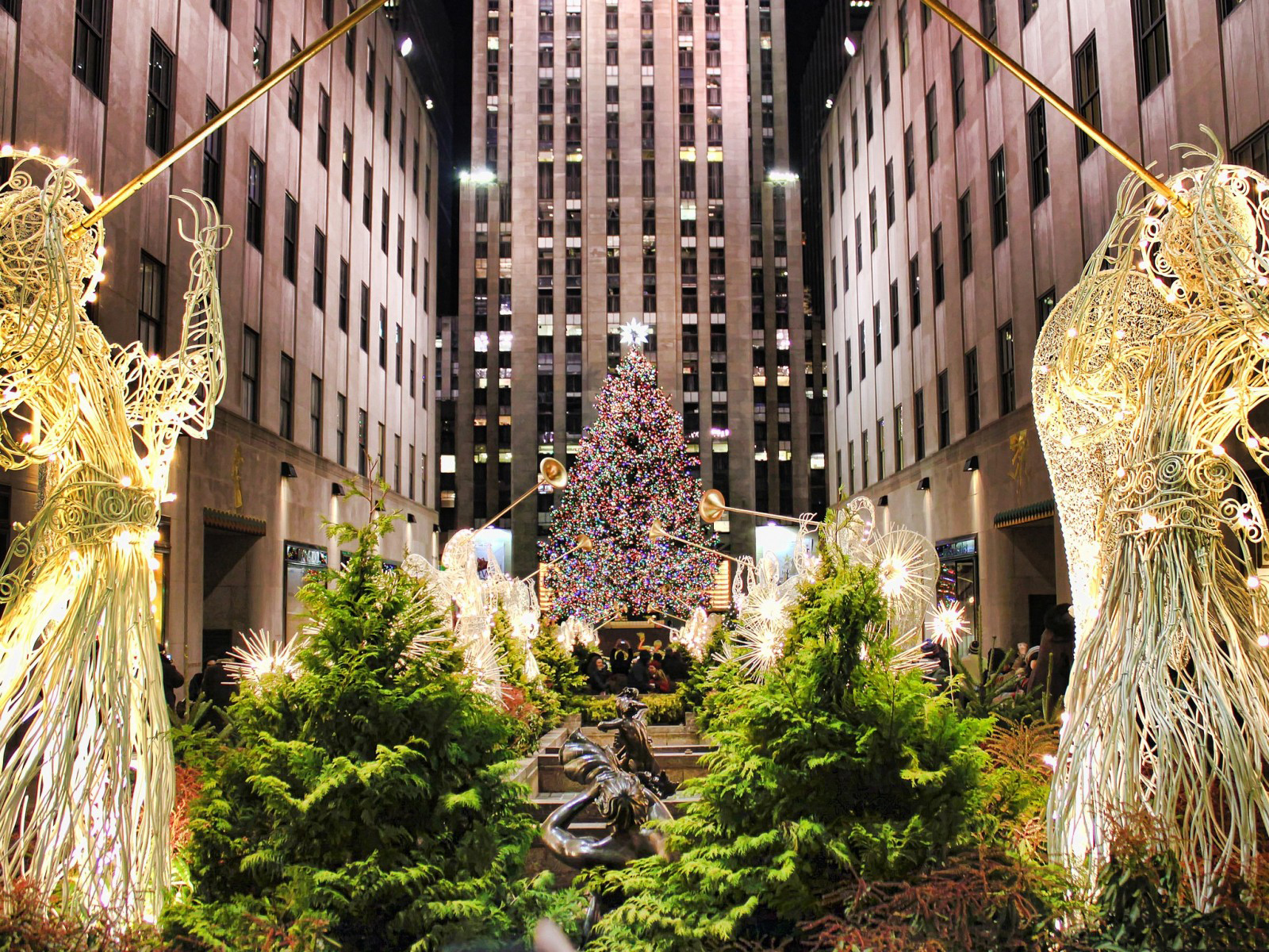Скачать обои для рабочего стола Новогодняя елка, светящиеся ангелы и фото