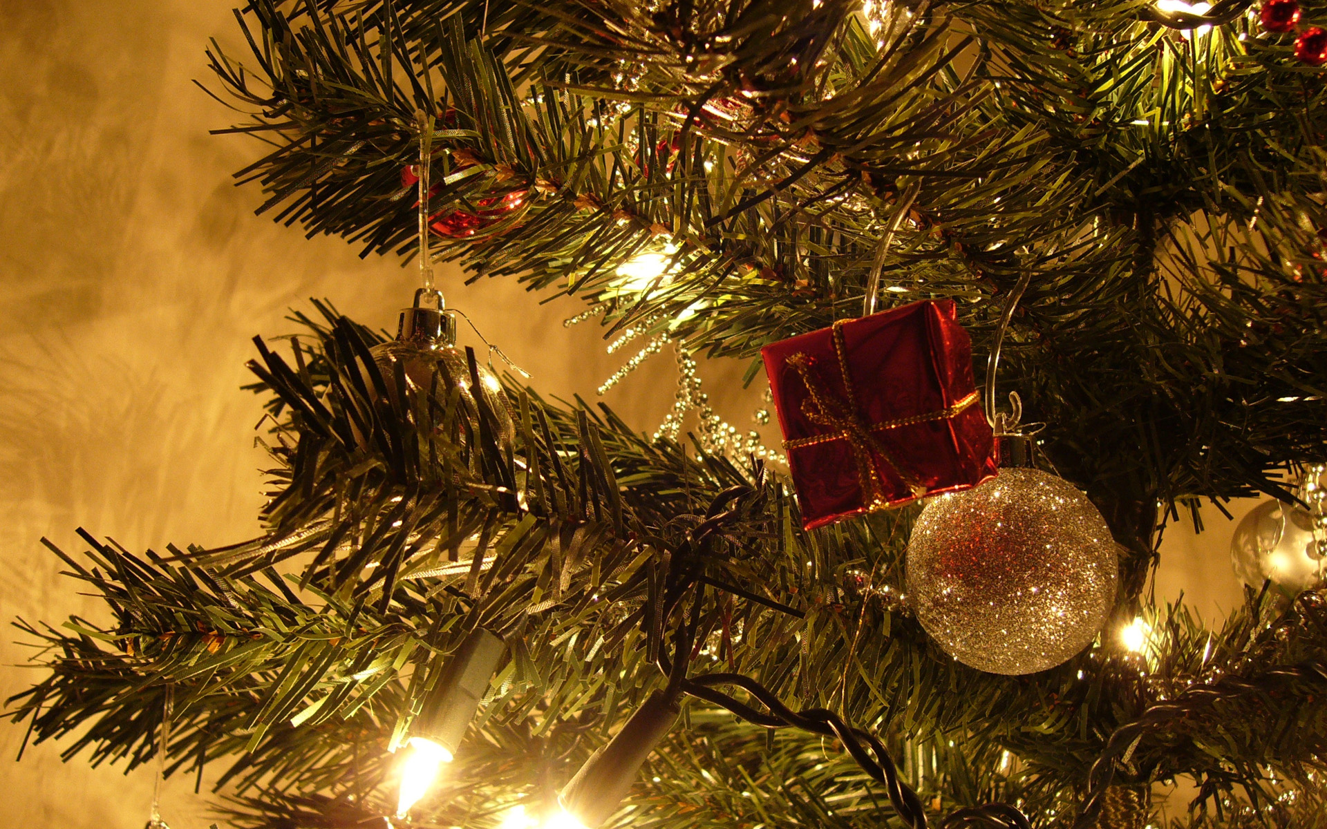 Обои Новогодняя ёлка украшенная шарами и огнями