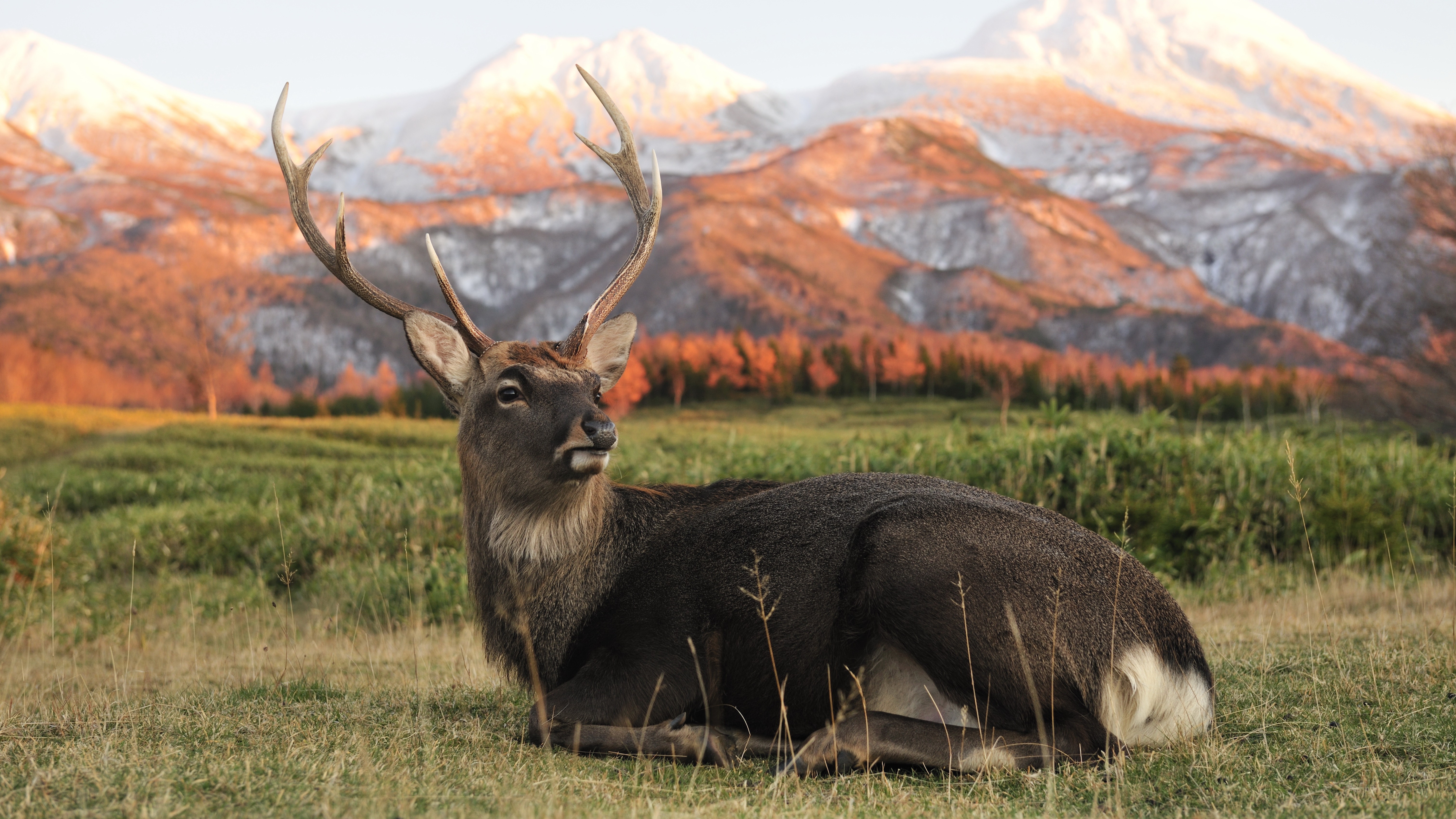 Скачать обои для рабочего стола Олень на фоне гор и фото