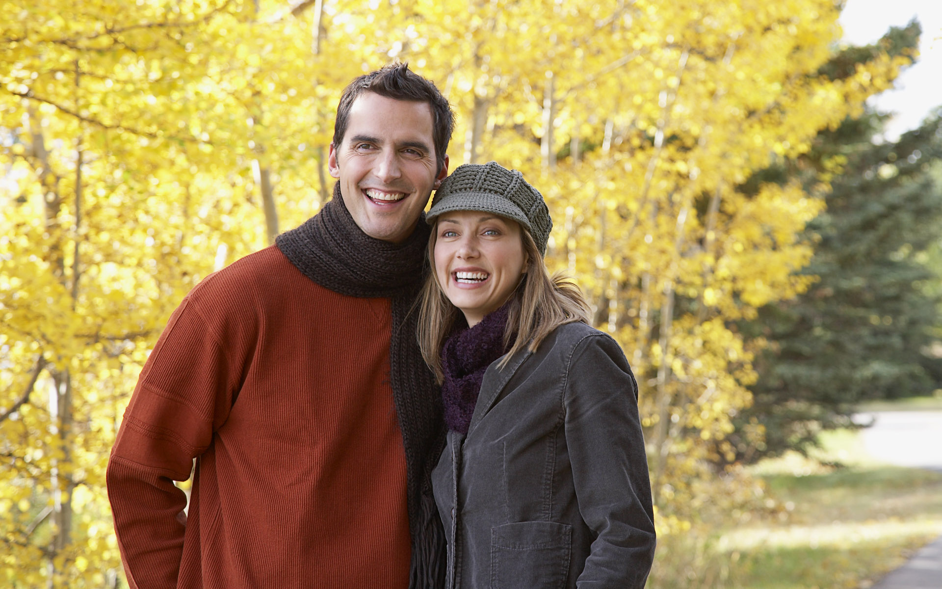 Скачать обои для рабочего стола Он и она в жёлтом лесу и фото