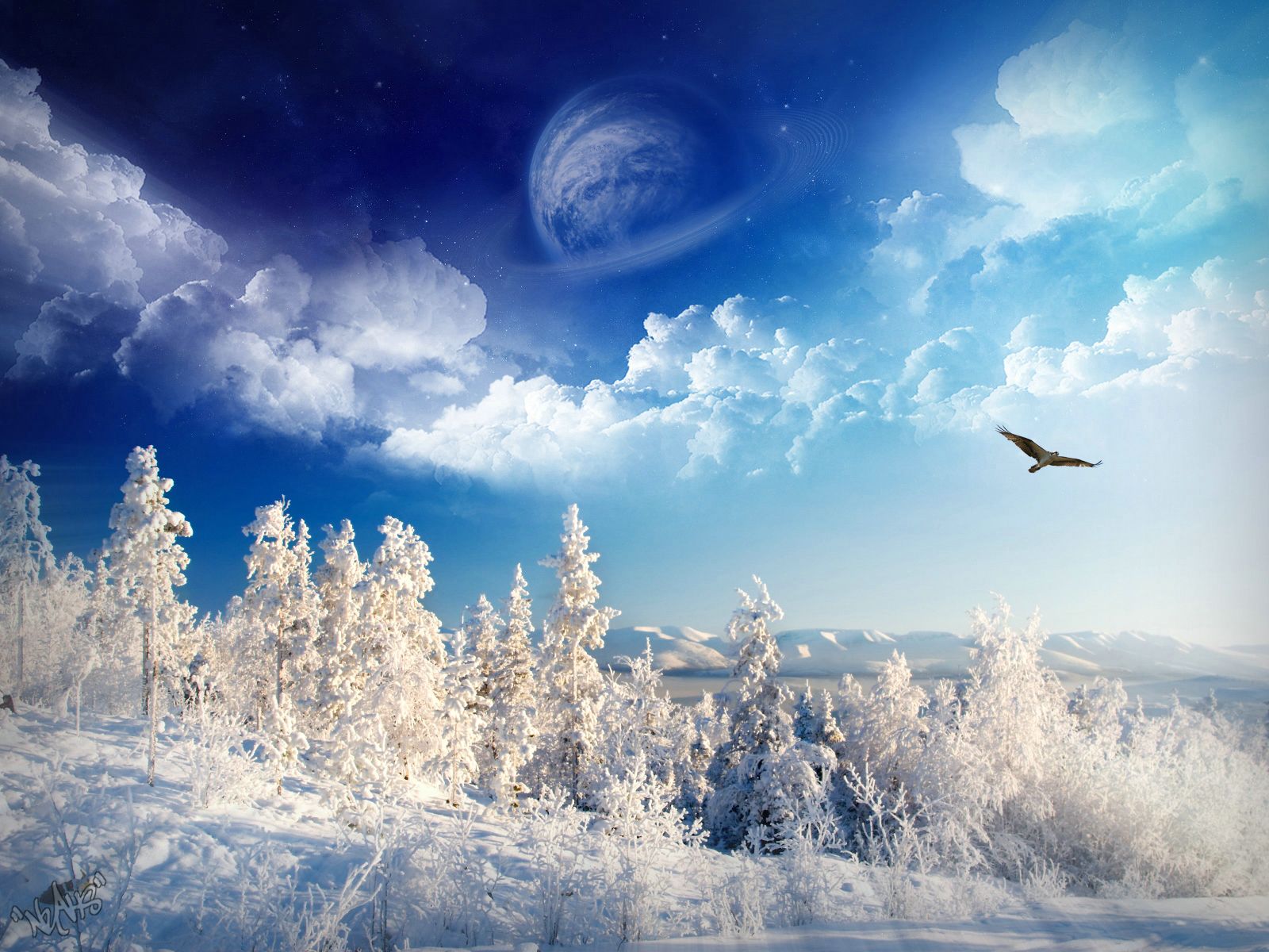 Скачать обои для рабочего стола Орел над заснеженным лесом и фото