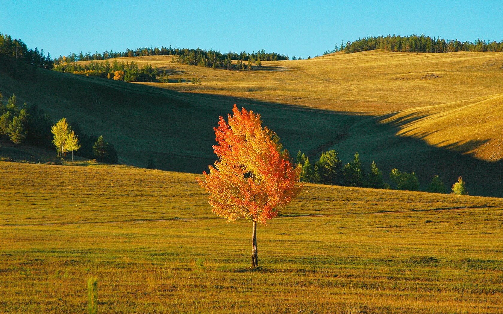 Скачать обои для рабочего стола Осеннее деревце с желтеющей листвой, на поле и фото