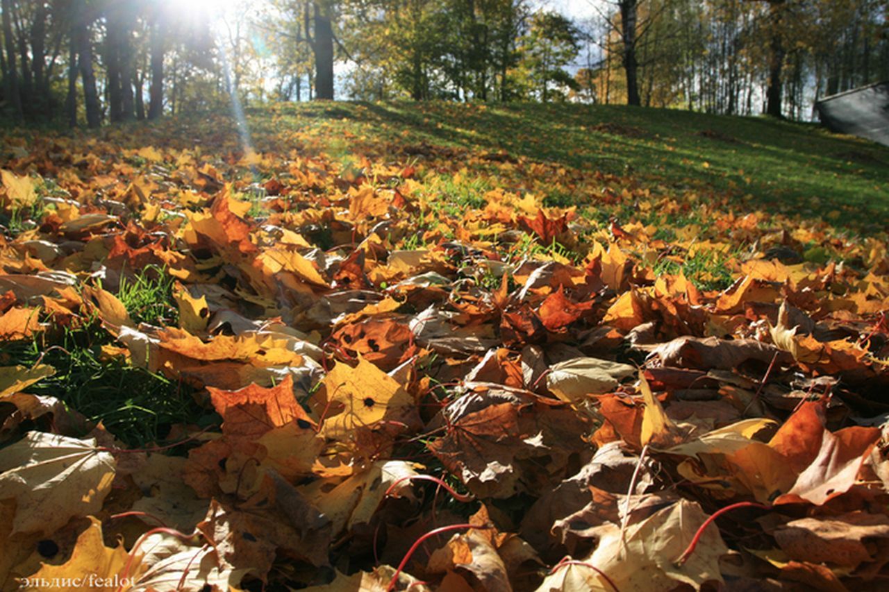Скачать обои для рабочего стола Осенние листья на солнечной полянке и фото
