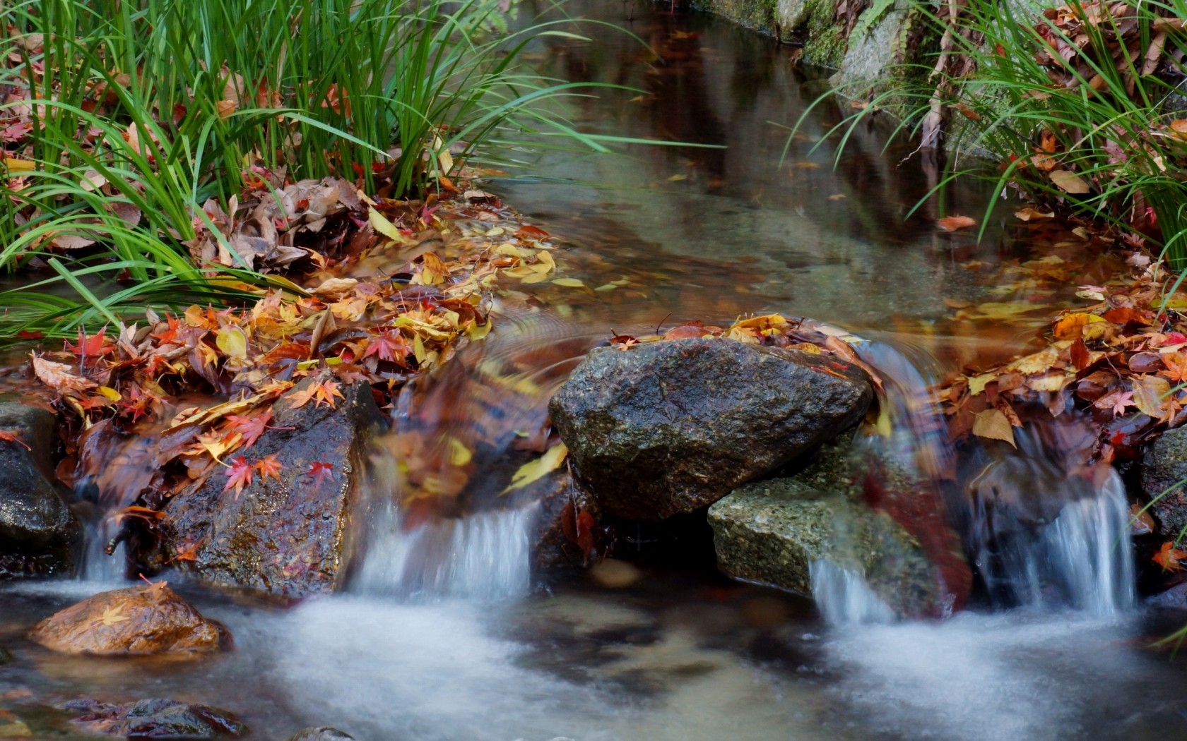 Скачать обои для рабочего стола Осенний ручей, украшенный листьями осени и фото
