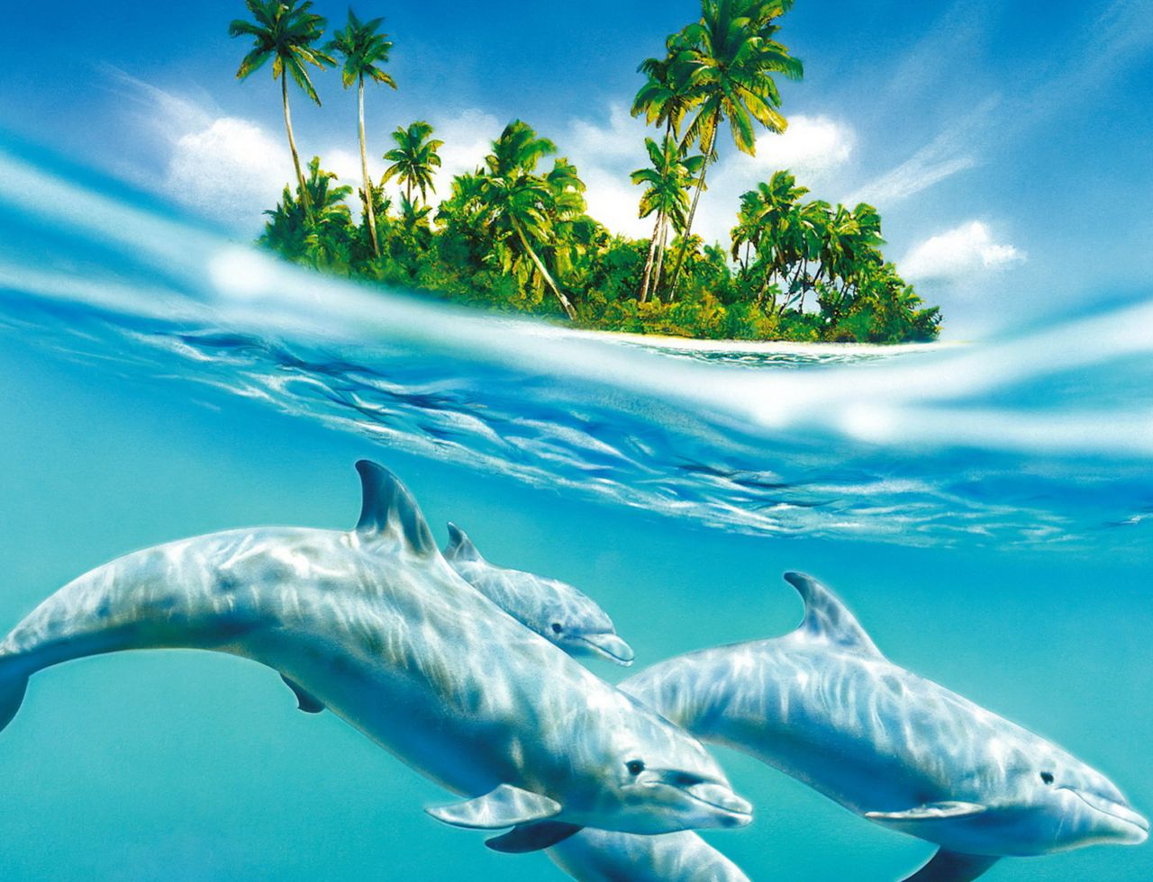 Скачать обои для рабочего стола Остров, море и дельфины и фото