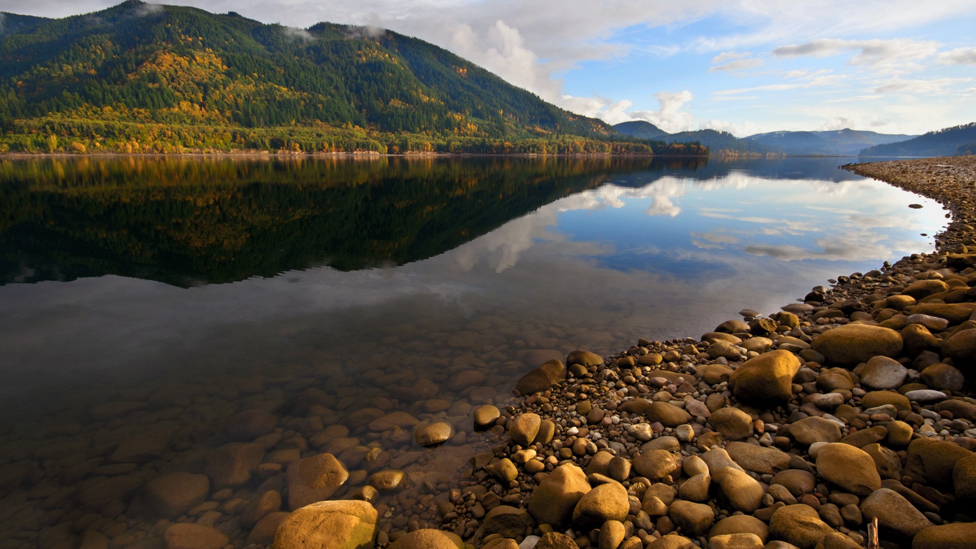 Похожие обои на Отполированные камни на берегу широкой реки, в горах: