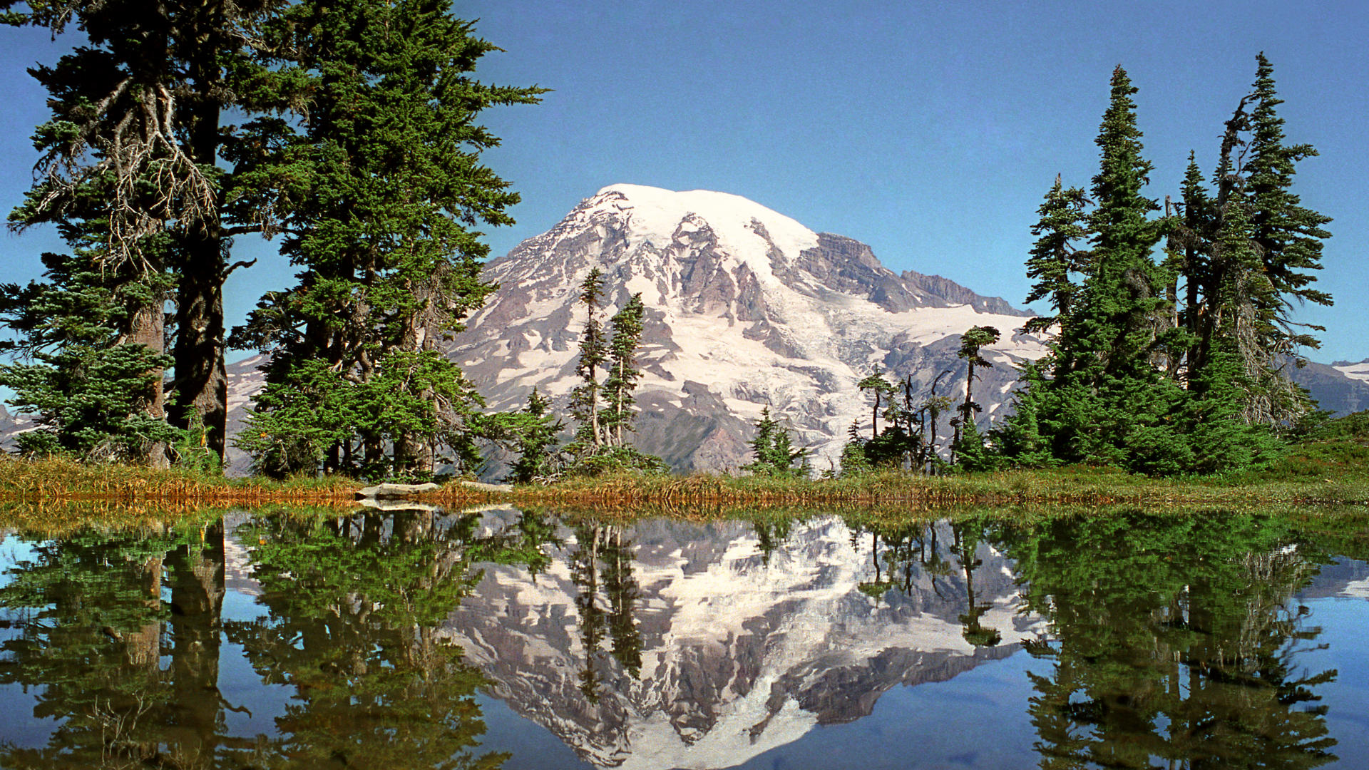 Скачать обои для рабочего стола Озеро с деревьями на берегу и далекая гора и фото