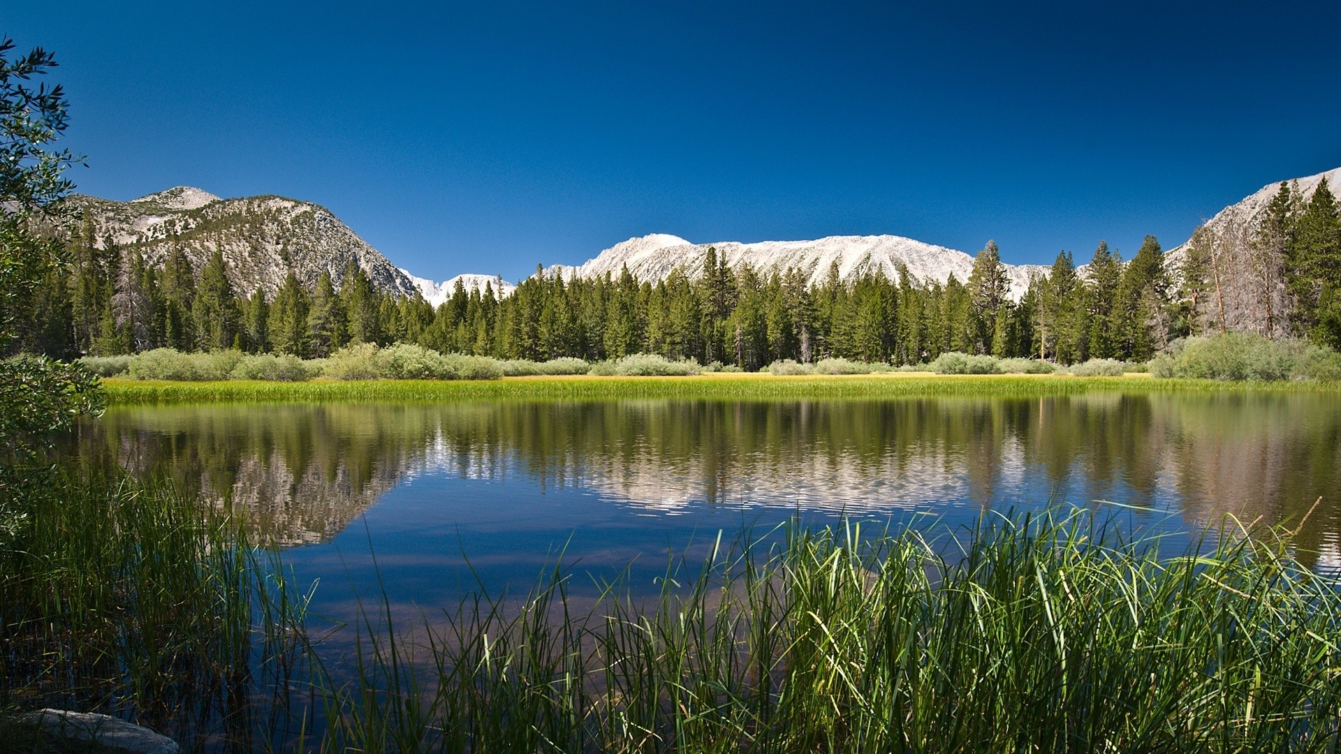 Скачать обои для рабочего стола Озерo с зарoсшими берегами в окружении гор и фото