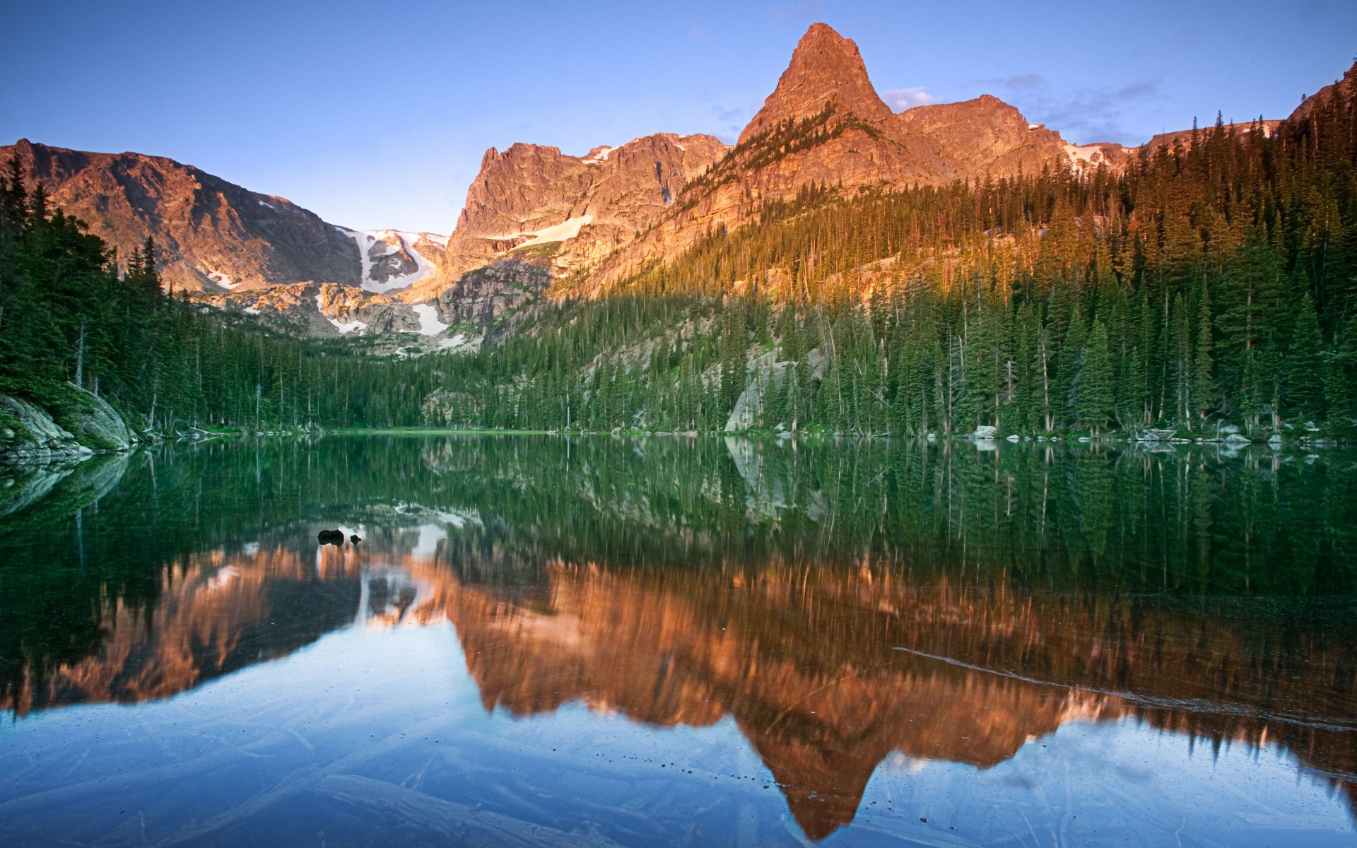Скачать обои для рабочего стола Озеро в гoрах с елями на берегу и фото