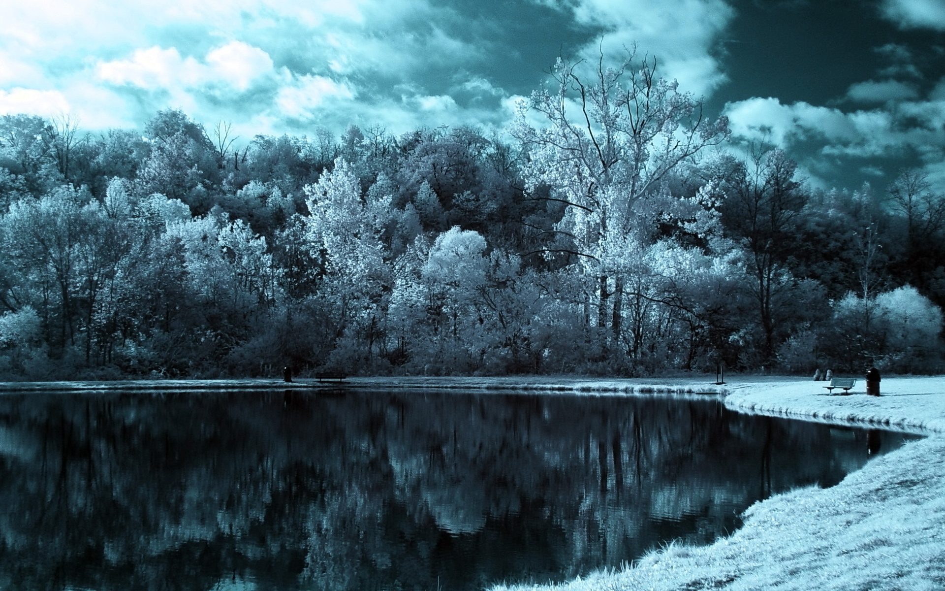 Скачать обои для рабочего стола Озеро в зимнем лесу и фото