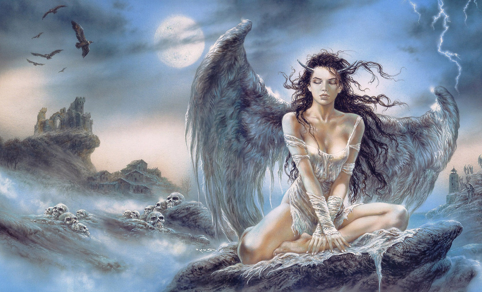 Скачать обои для рабочего стола Падший ангел среди черепов и фото