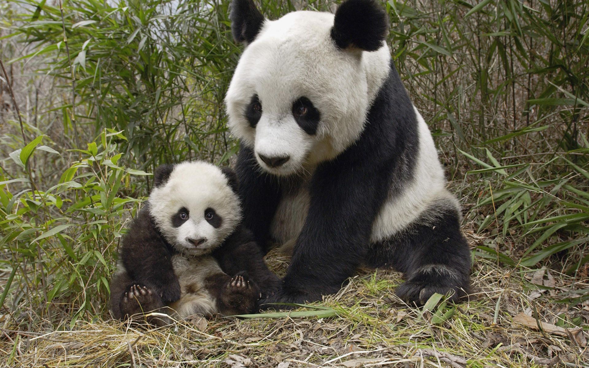 Скачать обои для рабочего стола Панда с детёнышем на сене и фото