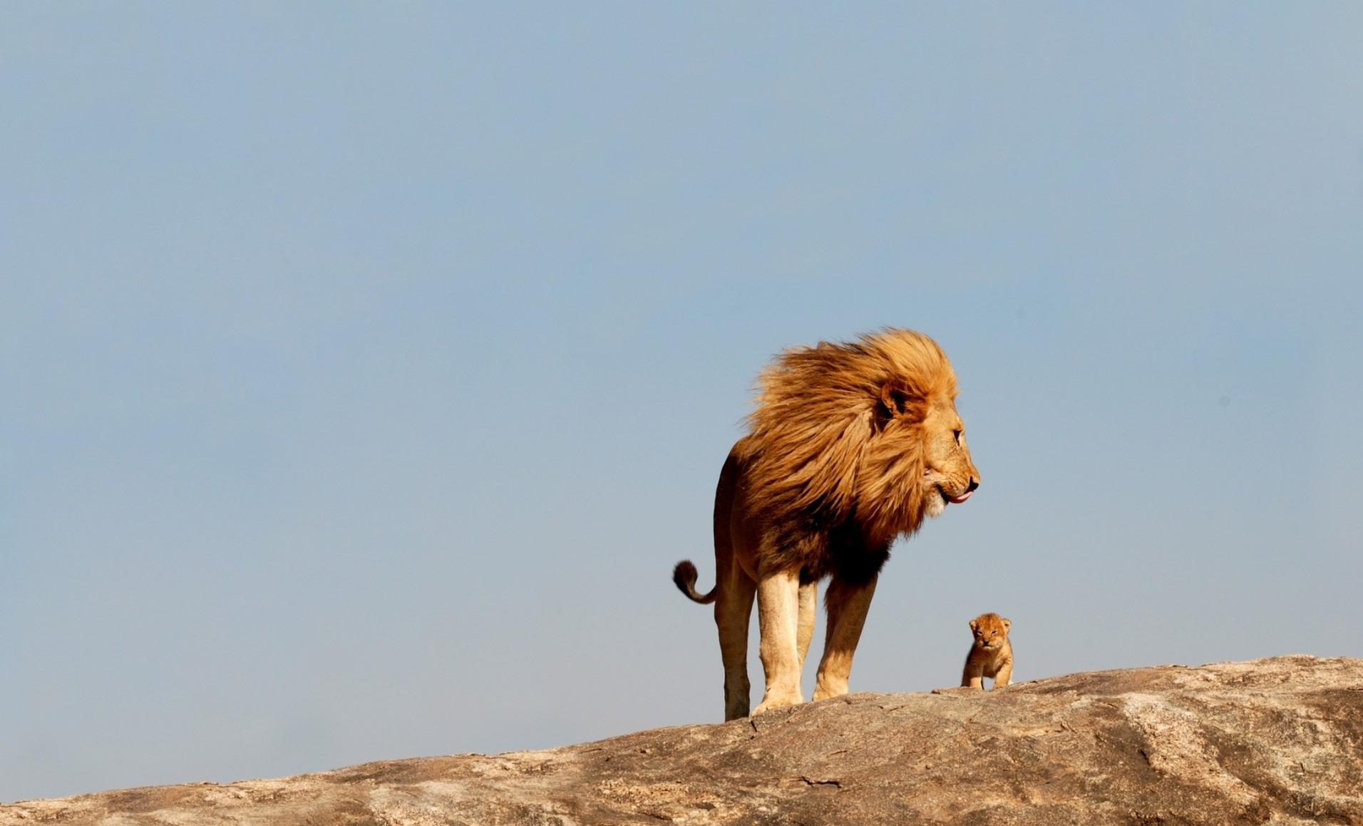 Скачать обои для рабочего стола Папа лев с детенышем на прогулке и фото