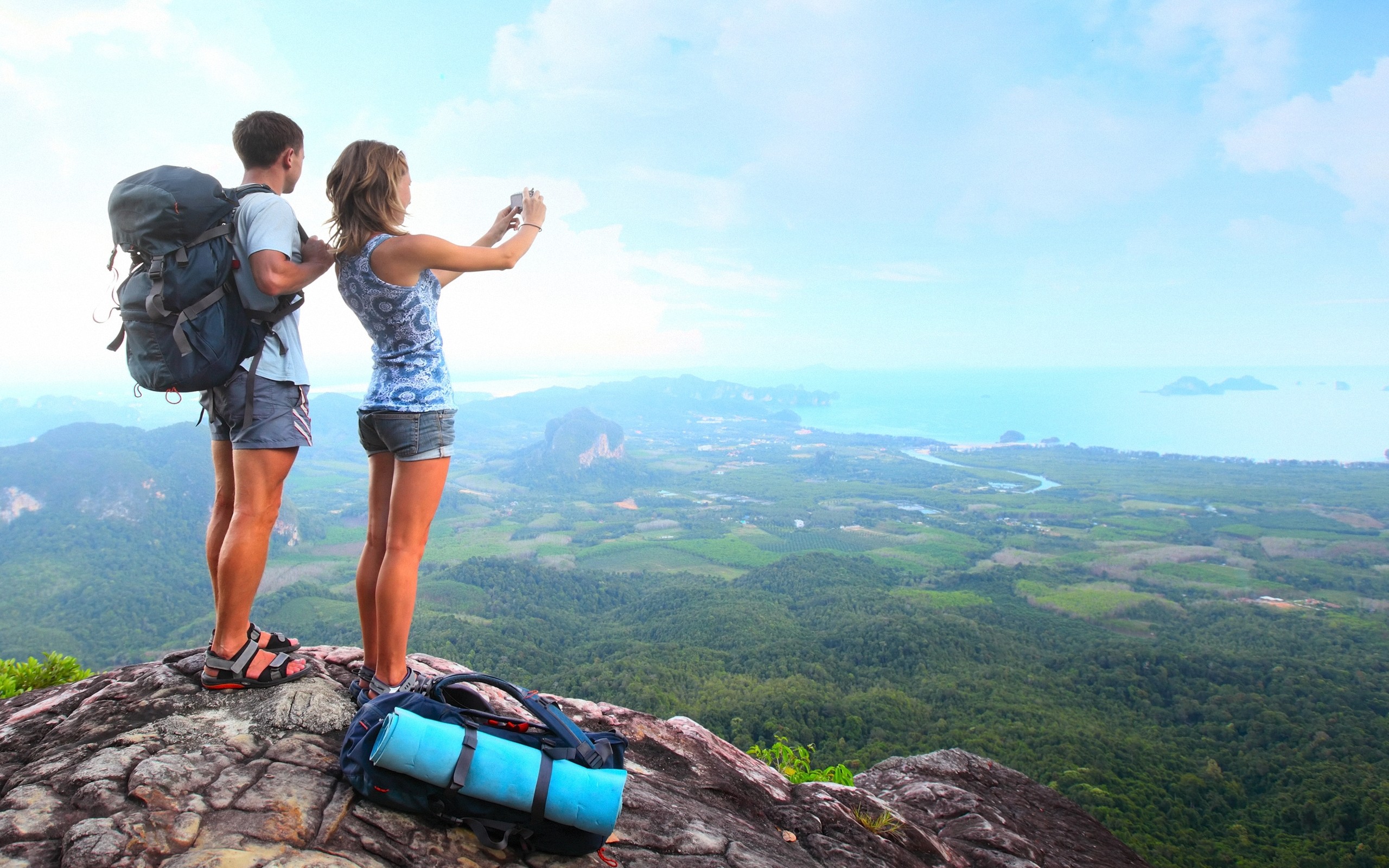 Скачать обои для рабочего стола Пара туристов на скалe и фото