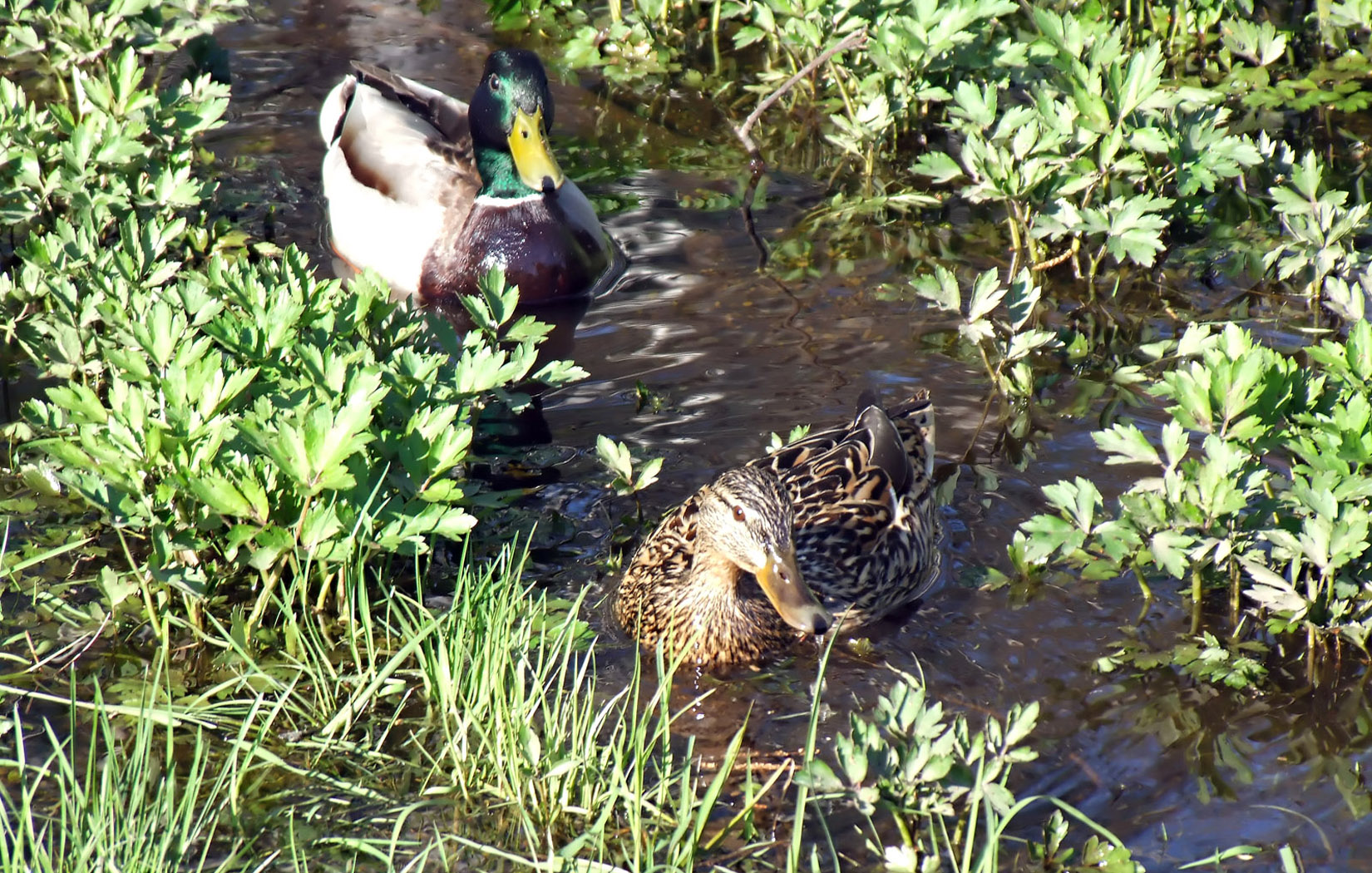 Обои Пара уточек в речном протоке