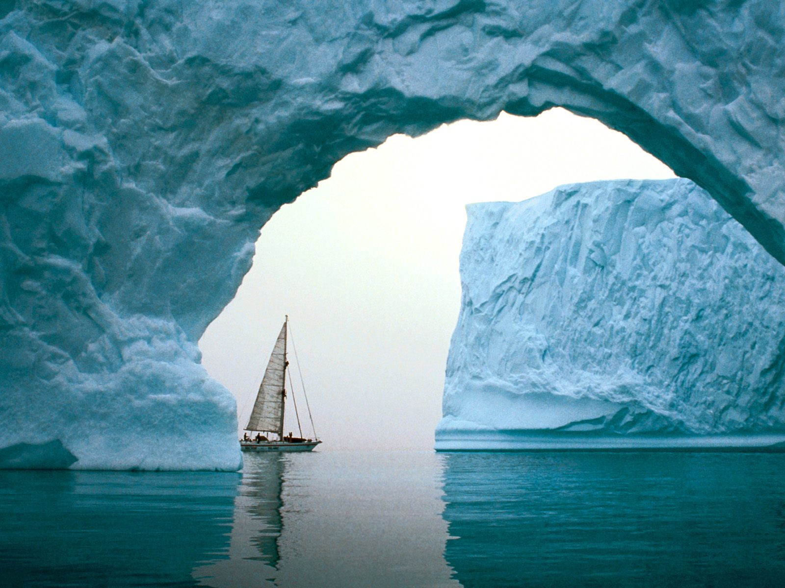 Скачать обои для рабочего стола Парусная лодка среди айсбергов и фото