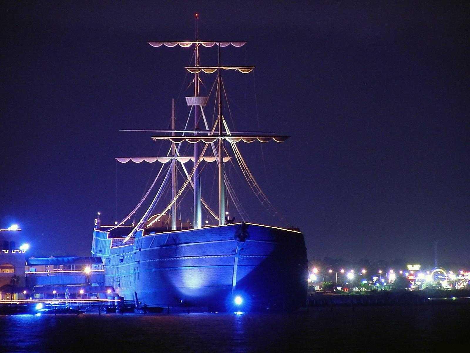 Скачать обои для рабочего стола Парусник на причале ночью и фото