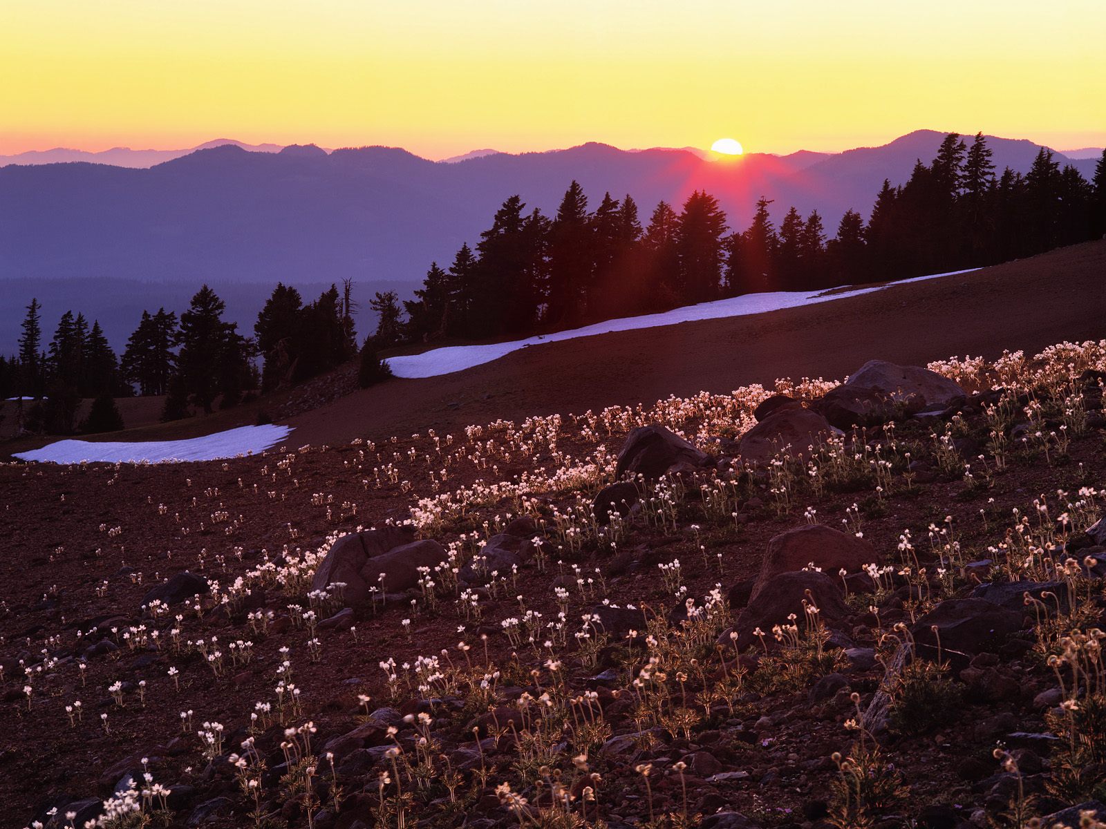 Скачать обои для рабочего стола Pasque Flowers, Crater Lake National Park at Sunset, Oregon и фото