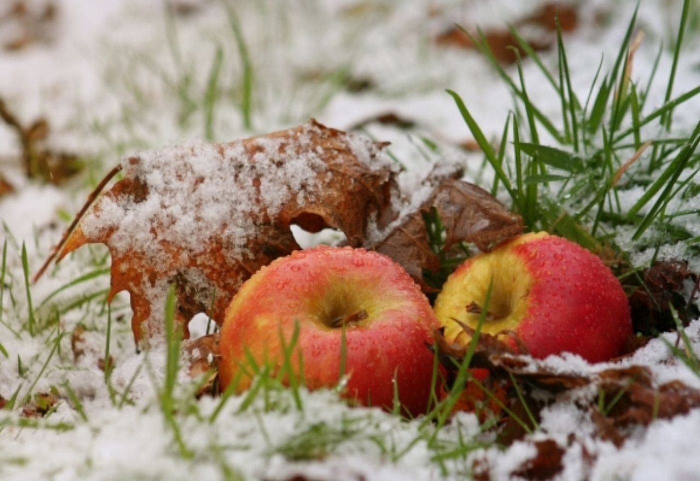Скачать обои для рабочего стола Первый снег и яблоки и фото