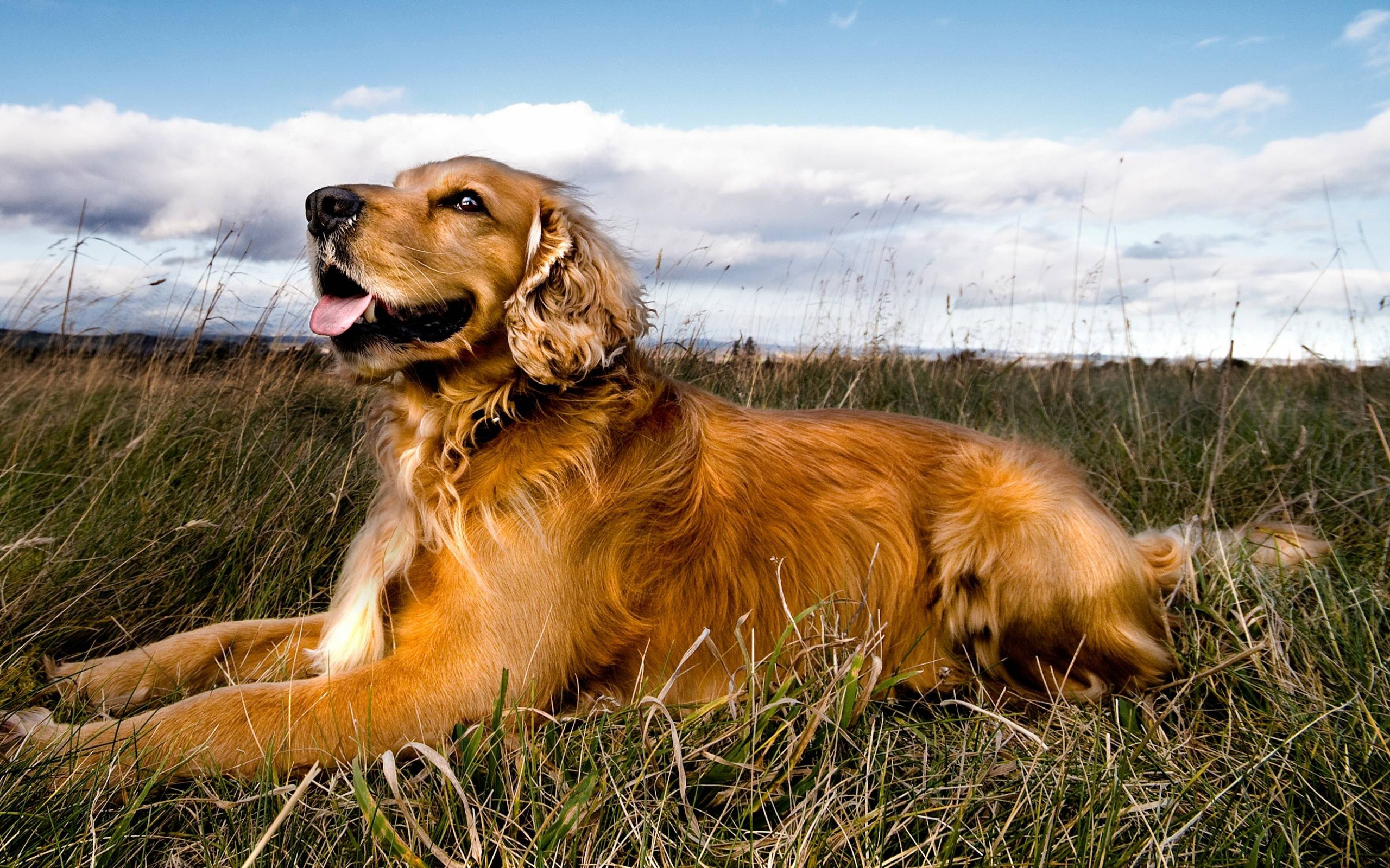 Скачать обои для рабочего стола Пес лежит в поле и фото