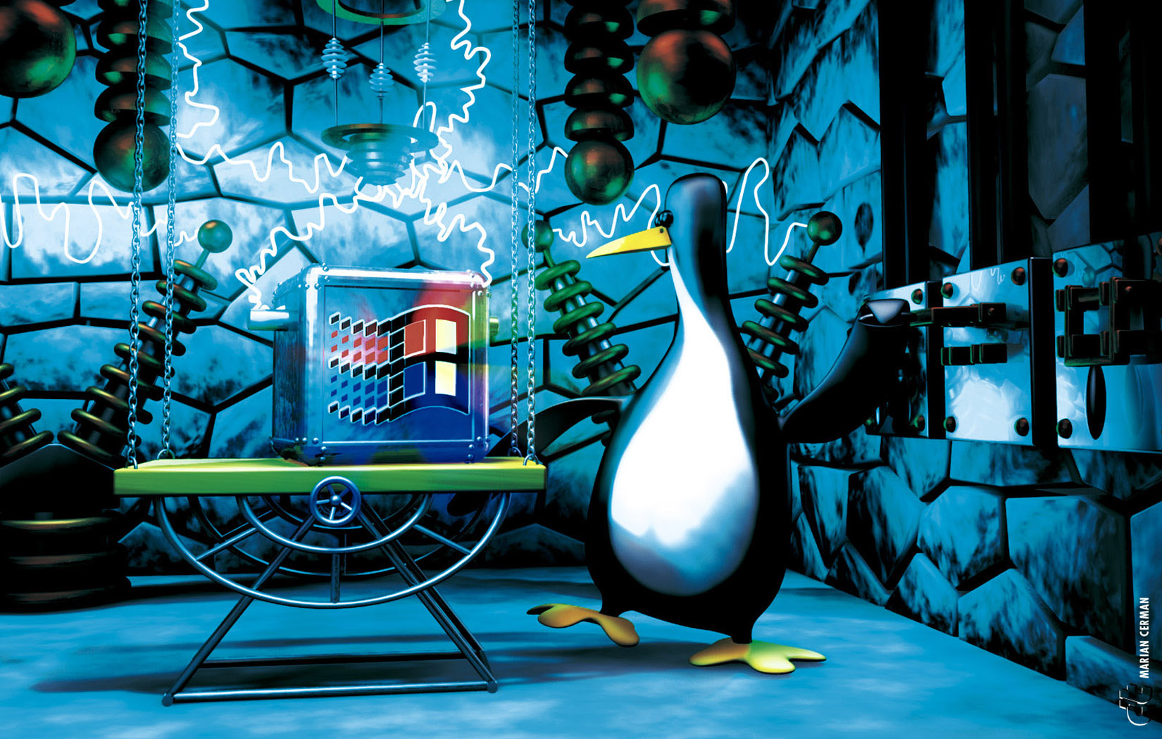 Скачать обои для рабочего стола Пингвин эксперементирует с Виндоус и фото