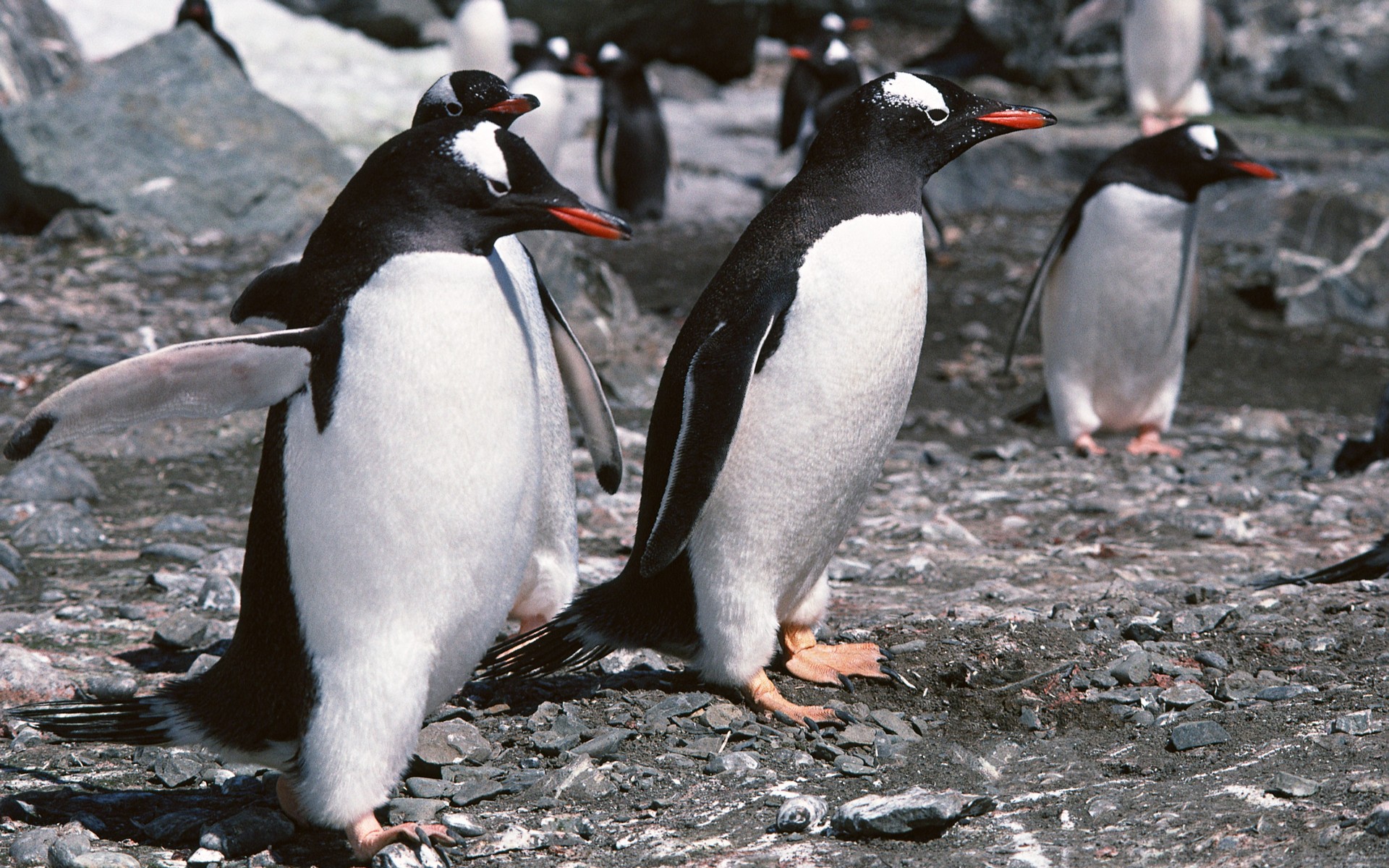Скачать обои для рабочего стола Пингвины на каменистом берегу и фото