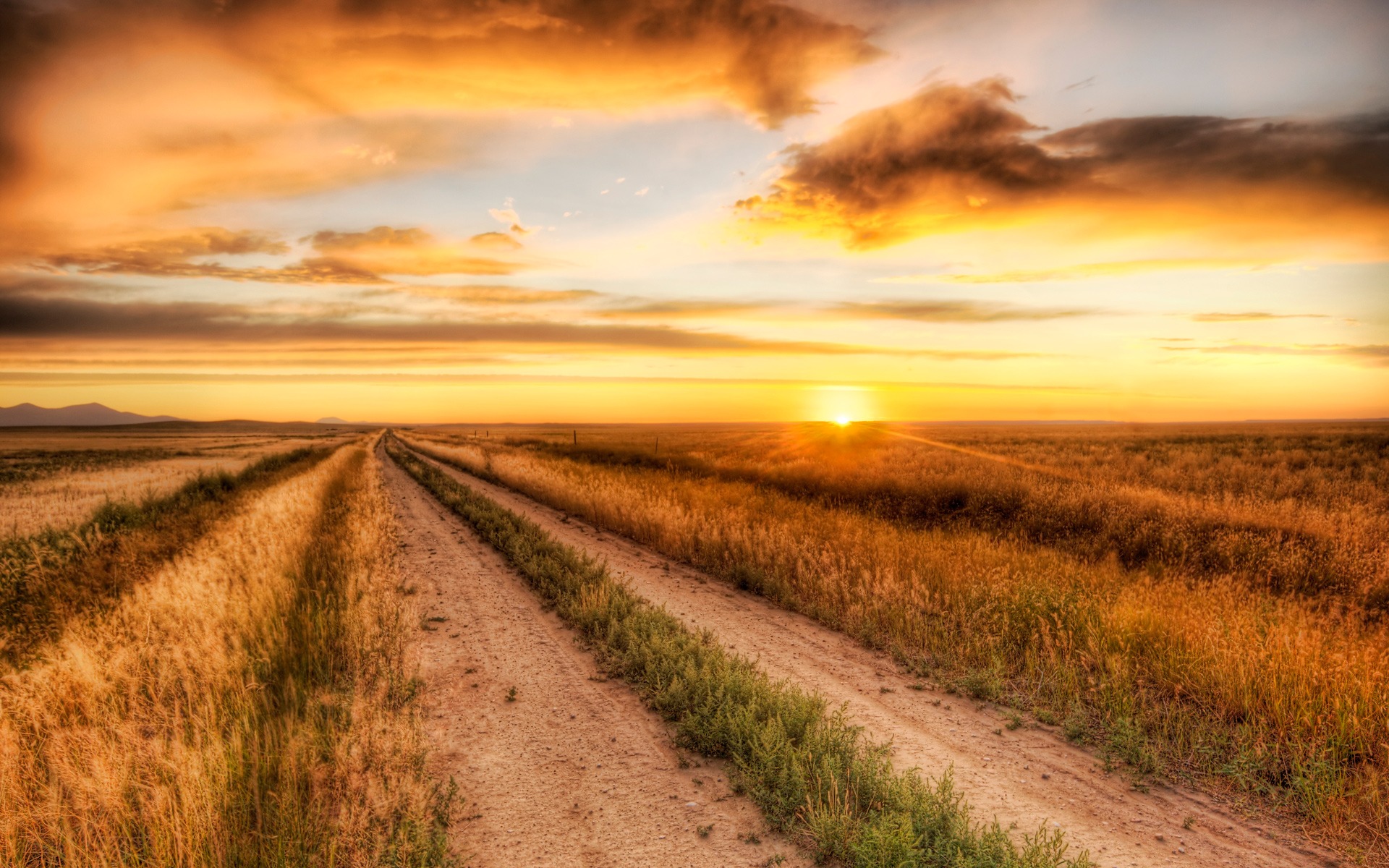 Скачать обои для рабочего стола Пламинеет закат над дорогой полевой и фото