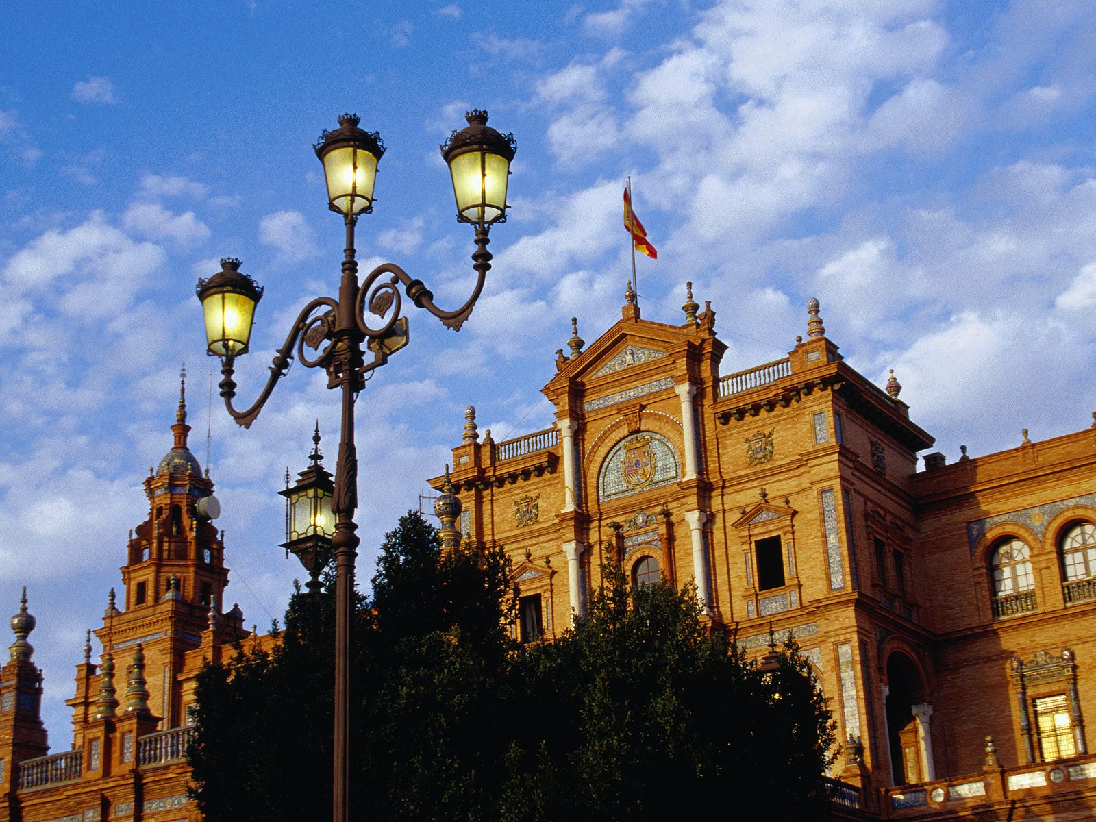 Скачать обои для рабочего стола Plaza de Espana at Sunset, Seville, Spain и фото