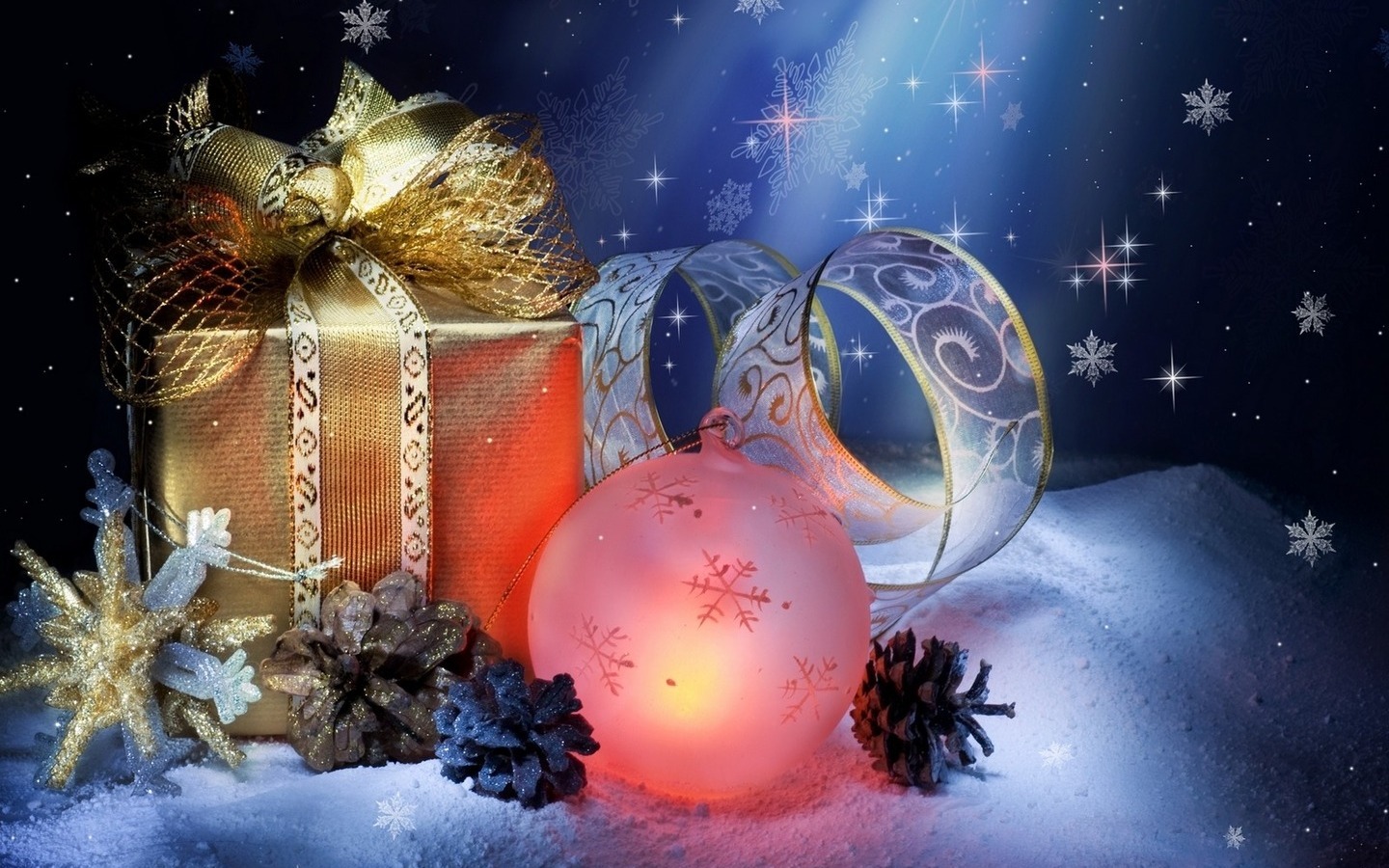 Скачать обои для рабочего стола Подарок и новогодние игрушки на снегу и фото